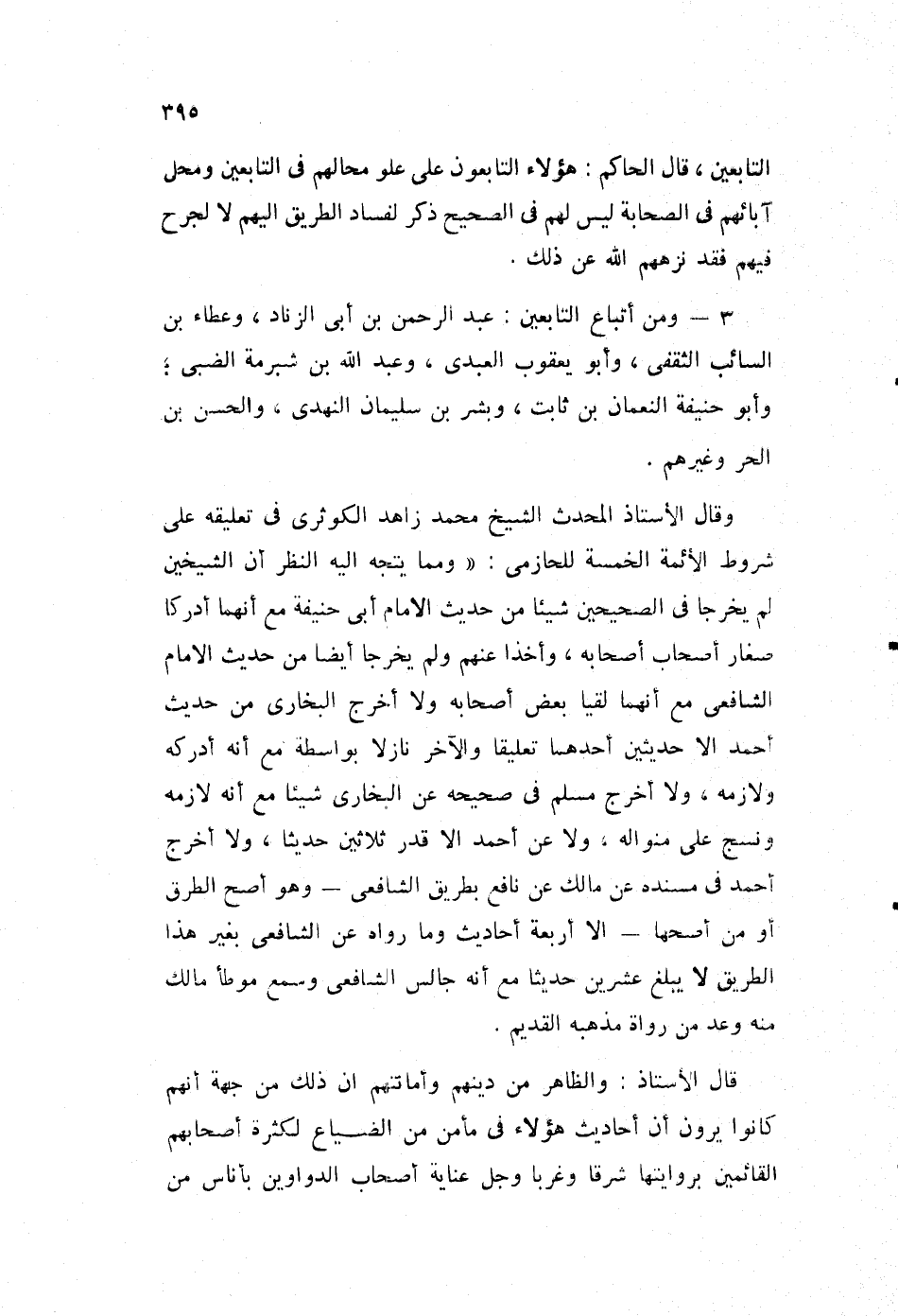 وقال الأستاذ المحدث، الشيخ محمد زاهد الكوثري، في تعليقه على شروط الأئمة الخمسة للحازمي: "ومما يتجه إليه النظر أن الشيخين لم يخرجا في الصحيحين شيئا من حديث الإمام أبي حنيفة، مع أنهما أدركا صغار أصحاب أصحابه، وأخذا عنهم ولم يخرجا أيا من حديث الإمام الشافعي، مع أنهما لقيا بعض أصحابه، ولا أخرج البخاري من حديث أحمد إلا حديثين، أحدهما تعليقا، والآخر نازلا بواسطة مع أنه أدركه ولازمه، ولا أخرج مسلم في صحيحه، عن البخاري شيئا مع أنه لازمه، ونسج على منواله، ولا عن أحمد إلا قدر ثلاثين حديثا، ولا أخرج أحمد في مسنده عن مالك، عن نافع بطريق الشافعي -وهو أصح الطرق أو من أصحها- إلا أربعة أحاديث، وما رواه عن الشافعي بغير هذا الطريق لا يبلغ عشرين حديثا، مع أنه جالس الشافعي، وسمع موطأ مالك منه وعد من رواة مذهبه القديم.