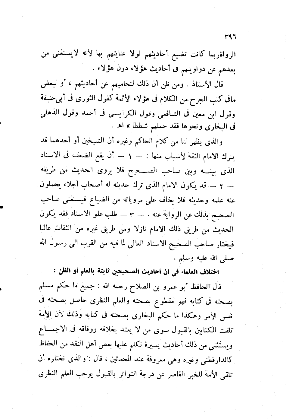 قال الحافظ أبو عمرو بن الصلاح رحمه الله: جميع ما حكم مسلم بصحته في كتابه فهو مقطوع بصحته، والعلم النظري حاصل بصحته في نفس الأم، وهكذا ما حكم البخاري بصحته في كتابه وذلك؛ لأن الأمة تلقت الكتابين بالقبول سوى من لا يعتد بخلافه، ووفاقه في الإجماع ويستثنى من ذلك أحاديث يسيرة، تكلم عليها بعض أهل النقد من الحفاظ كالدارقطني، وغيره وهي معروفة عند المحدثين، قال: والذي نختاره أن تلقى الأمة للخبر القاصر عن درجة التواتر بالقبول يوجب العلم النظري
