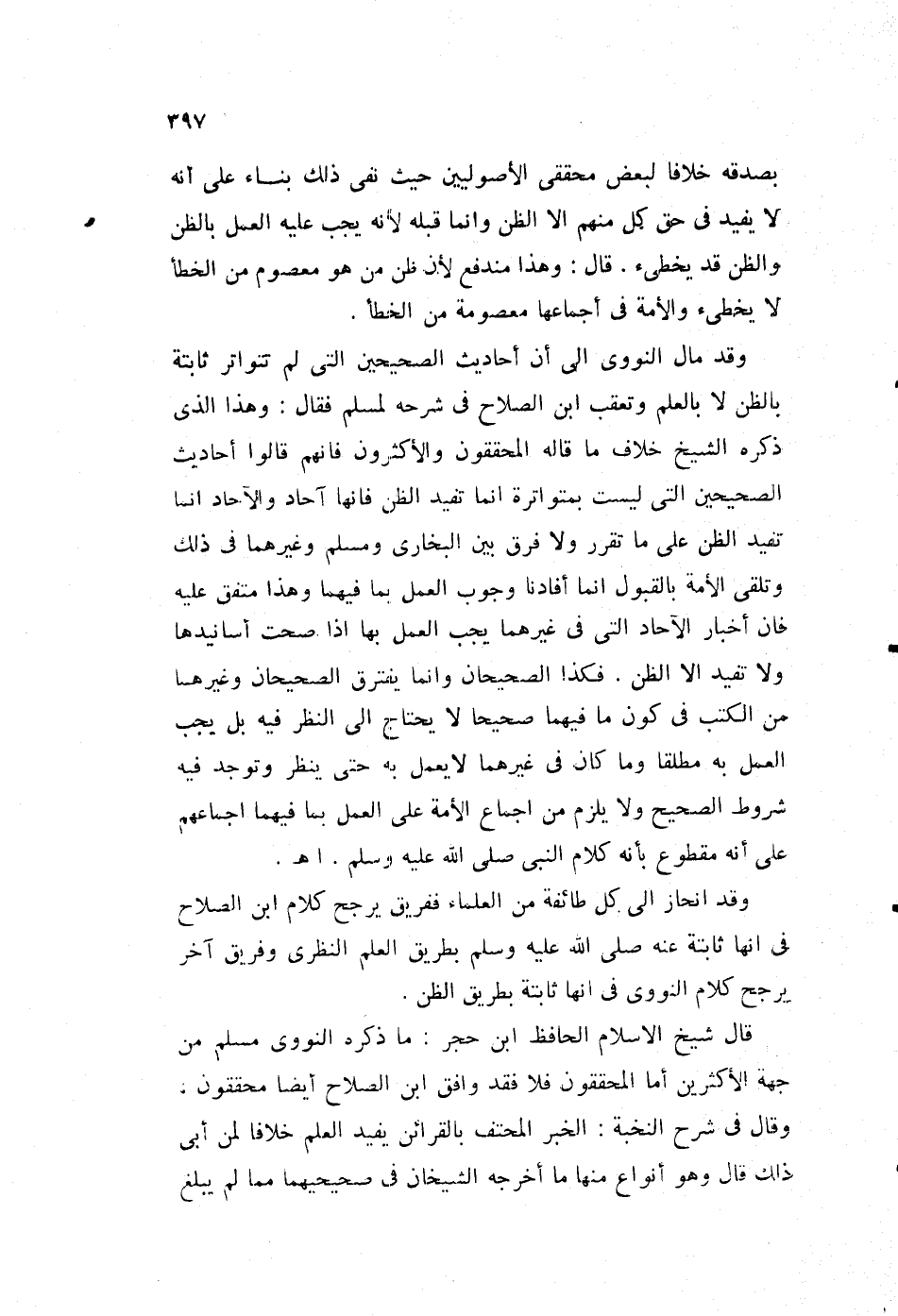 وقد مال النووي إلى أن أحاديث الصحيحين، التي لم تتواتر ثابتة بالظن لا بالعلم، وتعقب ابن الصلاح في شرحه لمسلم، فقال: وهذا الذي ذكره الشيخ خلاف ما قاله المحققون، والأكثرون، فإنهم قالوا: أحاديث الصحيحين التي ليست بمتواترة إنما تفيد الظن، فإنها آحاد والآحاد إنما تفيد الظن على ما تقرر، ولا فرق بين البخاري ومسلم، وغيرهما في ذلك وتلقي الأمة بالقبول، إنما أفادنا وجوب العمل بما فيهما وهذا متفق عليه، فإن أخبار الآحاد التي في غيرها يجب العمل بها، إذا صحت أسانيدها ولا تفيد إلا الظن. فكذا الصحيحان، وإنما يفترق الصحيحان، وغيرهما من الكتب في كون ما فيهما صحيحا لا يحتاج إلى النظر فيه، بل يجب العمل به مطلقا، وما كان في غيرهما لا يعمل به حتى ينظر، وتوجد فيه شروط الصحيح، ولا يزلم من إجماع الأمة على العمل بما فيهما إجماعهم على أنه مقطوع، بأنه كلام النبي صلى الله عليه وسلم. ا. هـ.