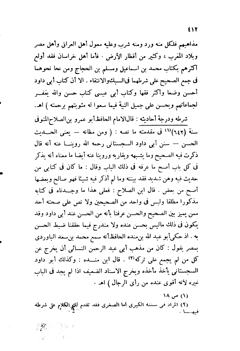 مذاهبهم فلكل منه ورد، ومنه شرب وعليه معول أهل العراق، وأهل مصر وبلاد المغرب، وكثير من أقطار الأرض. فأما أهل خراسان، فقد أولع أكثرهم بكتاب محمد بن إسماعيل، ومسلم بن الحجاج ومن نحا نحوهما في جمع الصحيح على شرطهما في السبك والانتقاء. إلا أن كتاب أبي داود أحسن وضعا، وأكثر فقها، وكتاب أبي عيسى كتاب حسن، والله يغفر لجماعاتهم، ويحسن على جميل النية، فيما سعوا له مثوبتهم برحمته". ا. هـ.