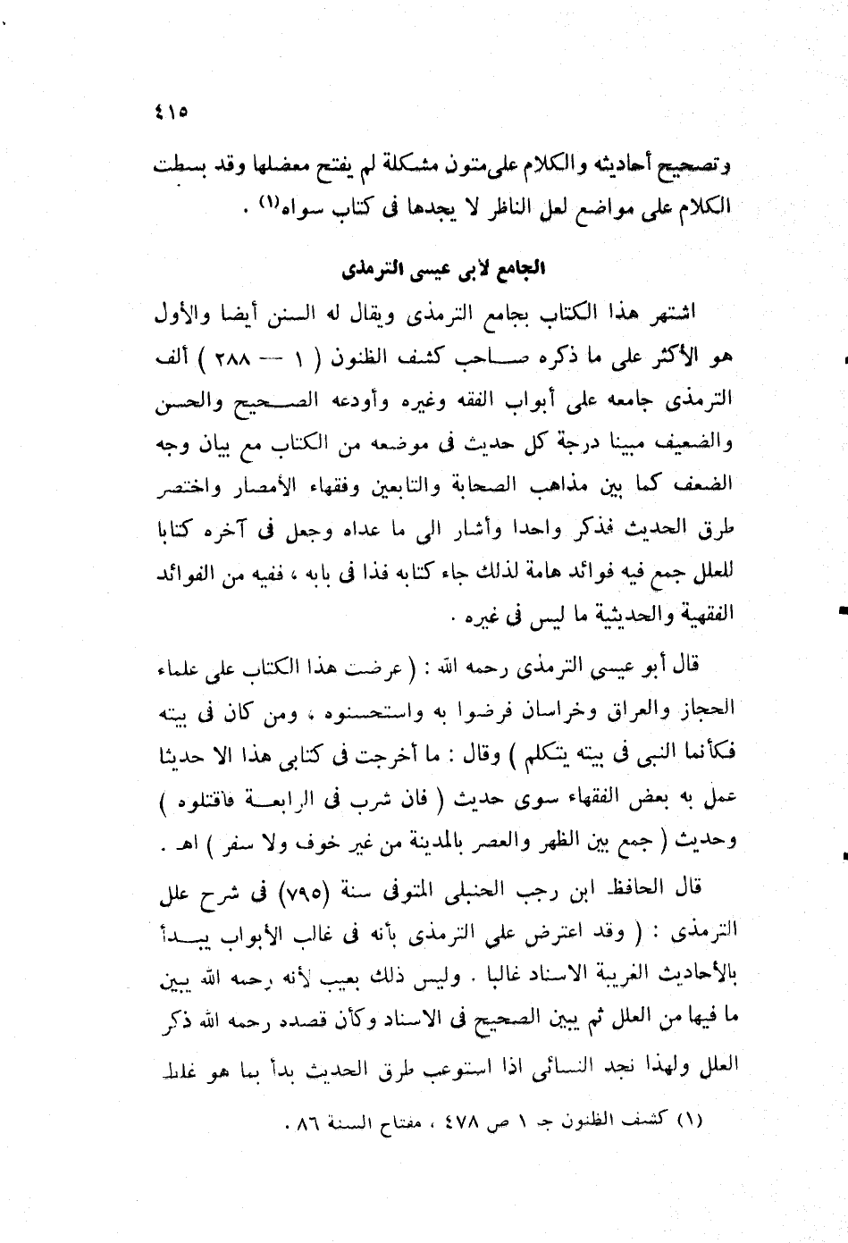 قال الحافظ ابن رجب الحنبلي، المتوفى سنة "795" في شرح علل الترمذي: "وقد اعترض على الترمذي بأنه في غالب الأبواب، يبدأ بالأحاديث الغريبة الإسناد غالبا. وليس ذلك بعيب؛ لأنه رحمه الله يبين ما فيها من العلل، ثم يبين الصحيح في الإسناد، وكأن قصده رحمه الله ذكر العلل، ولهذا نجد النسائي إذا استوعب طرق الحديث بدأ بما هو غلط