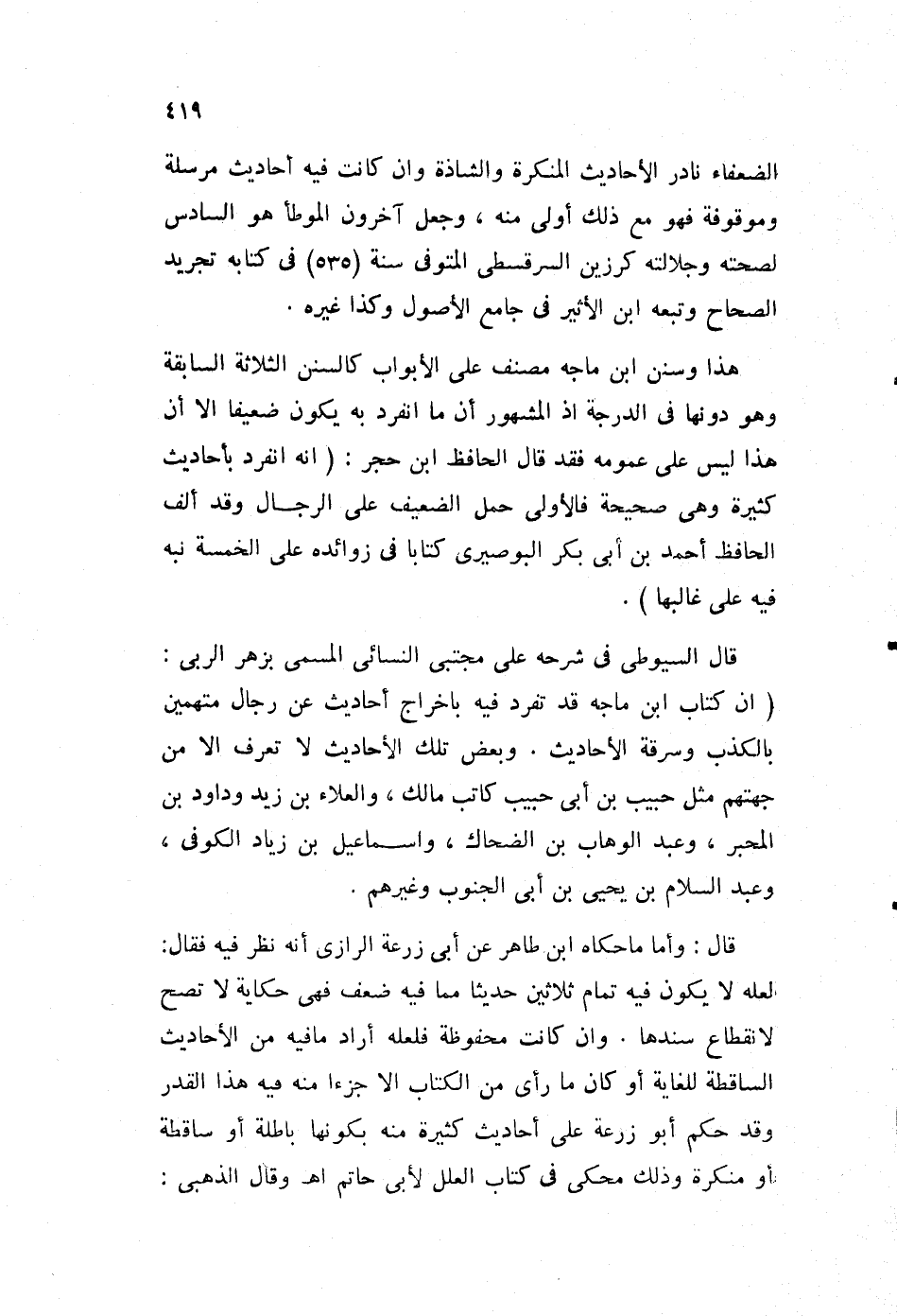 "إن كتاب ابن ماجه قد تفرد فيه بإخراج أحاديث، عن رجال متهمين بالكذب وسرقة الأحاديث. وبعض تلك الأحاديث، لا تعرف إلا من جهتهم مثل حبيب بن أبي حبيب كاتب مالك، والعلاء بن زيد وداود بن المحبر، وعبد الوهاب بن الضحاك، وإسماعيل بن زياد الكوفي، وعبد السلام بن يحيى بن أبي الجنوب، وغيرهم.