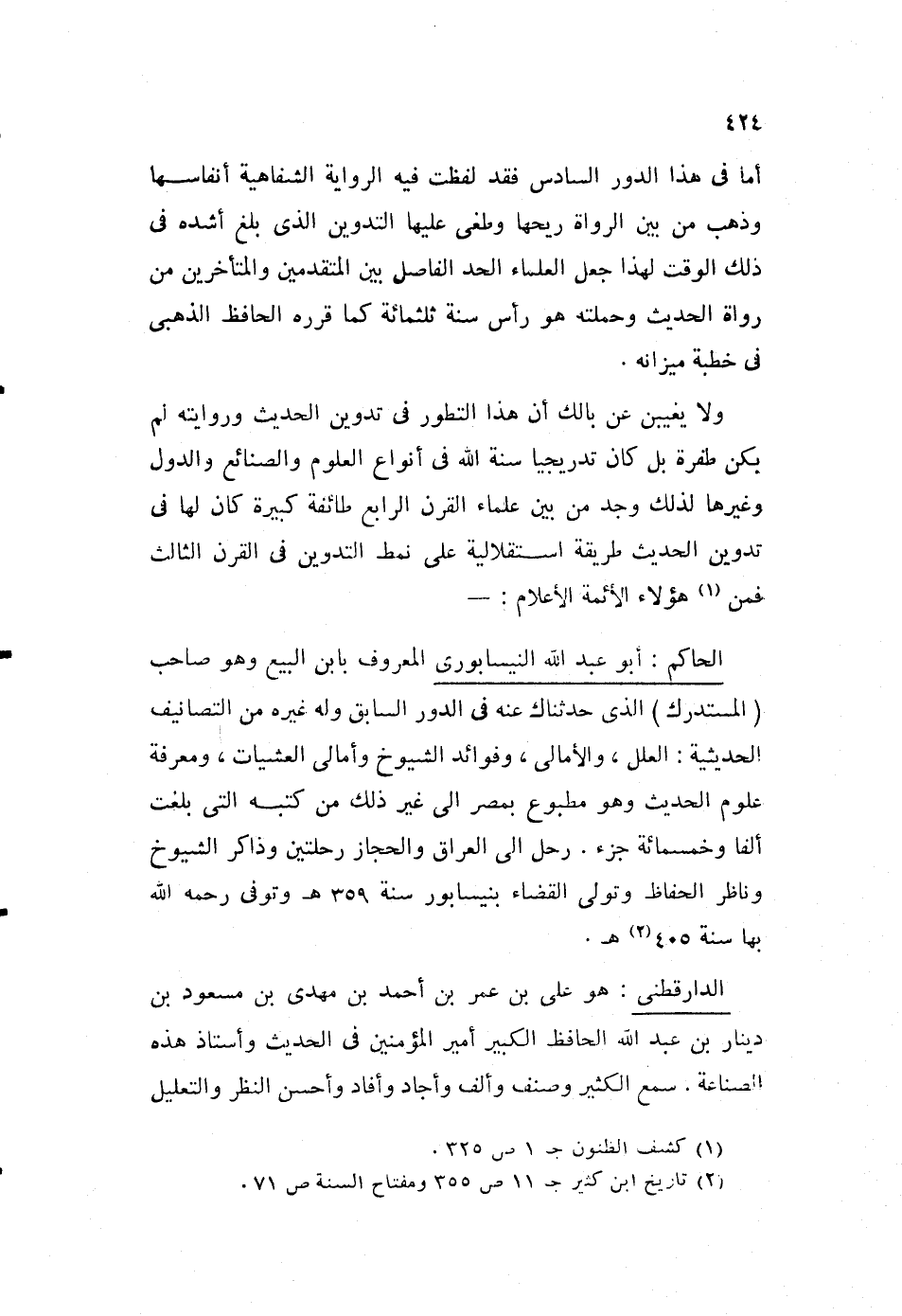 ولا يغيبن عن بالك أن هذا التطور في تدوين الحديث، وروايته لم يكن طفرة بل كان تدريجيا سنة الله في أنواع العلوم، والصنائع، والدول وغيرها لذلك وجد من بين علماء القرن الرابع طائفة كبيرة، كان لها في تدوين الحديث، طريقة استقلالية على نمط التدوين في القرن الثالث، فمن1 هؤلاء الأئمة الأعلام: