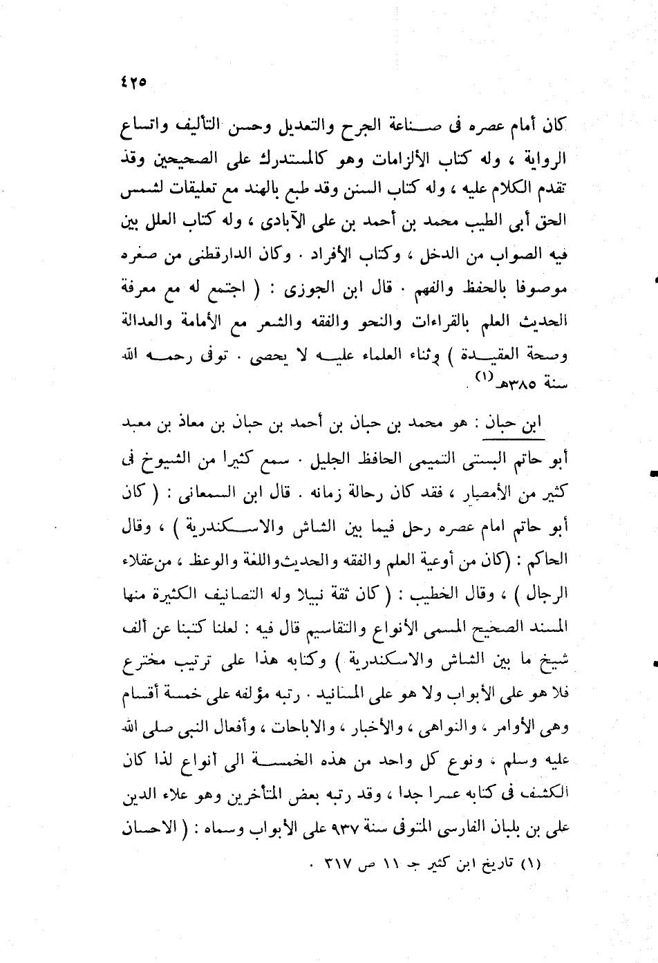 ابن حبان: هو محمد بن حبان بن أحمد بن حبان بن معاذ بن معبد، أبو حاتم البستي التميمي، الحافظ الجليل. سمع كثير من الشيوخ في كثير من الأمصار، فقد كان رحالة زمانه. قال ابن السمعاني: "كان أبو حاتم، إمام عصره رحل فيما بين الشاش والإسكندرية"، وقال الحاكم: "كان من أوعية العلم والفقه والحديث، واللغة والوعظ، من عقلاء الرجال"، وقال الخطيب: "كان ثقة نبيلا وله التصانيف الكثيرة منها المسند الصحيح المسمى الأنواع، والتقاسيم قال فيه: لعلنا كتبنا عن ألف شيخ ما بين الشاش والإسكندرية"، وكتابه هذا على ترتيب مخترع.