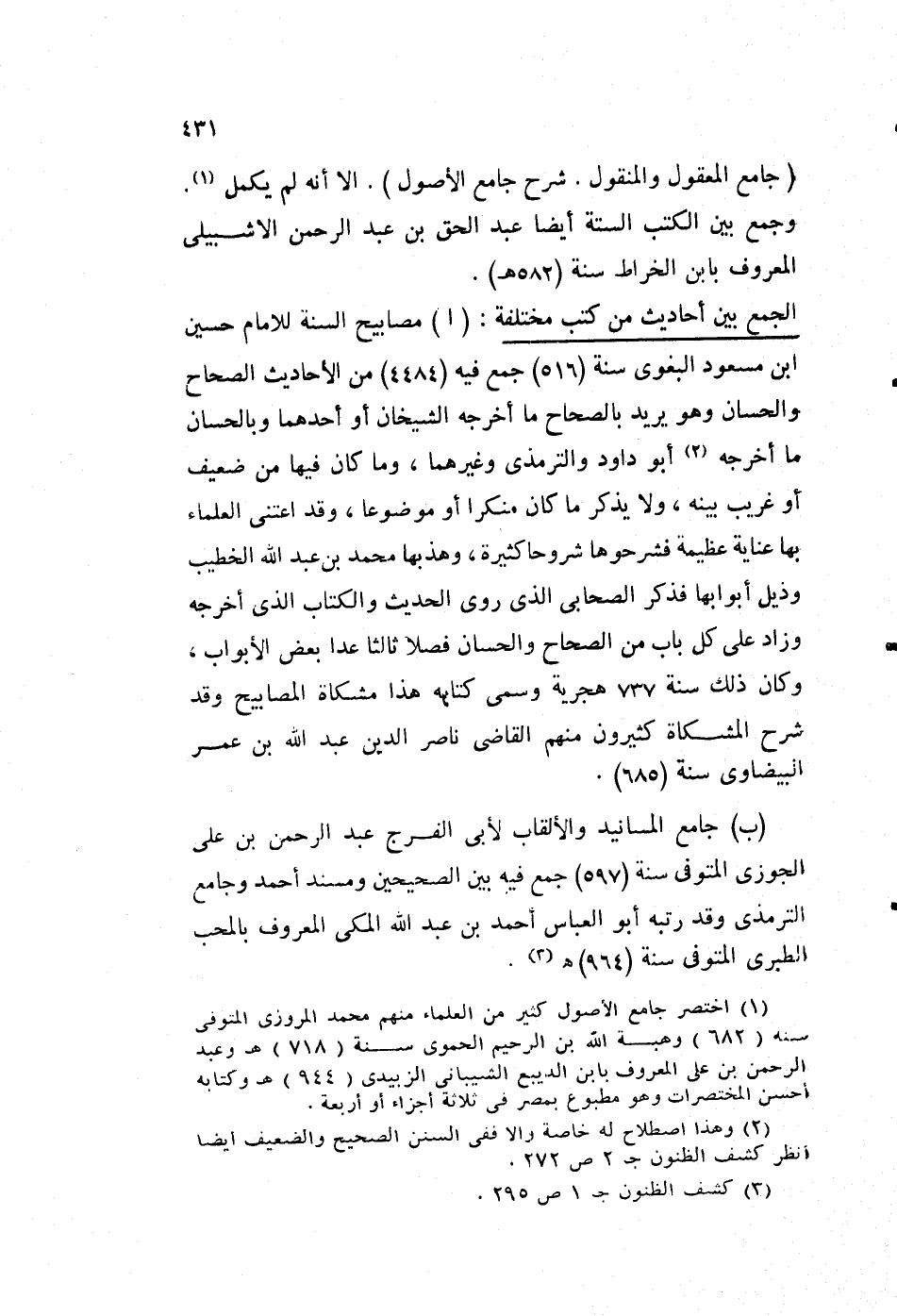 أ- مصابيح السنة للإمام حسين بن مسعود البغوي سنة "516"، جمع فيه "4484" من الأحاديث الصحاح، والحسان وهو يريد بالصحاح ما أخرجه الشيخان، أو أحدهما وبالحسان ما أخرجه2 أبو داود، والترمذي وغيرهما، وما كان فيها من ضعيف، أو غريب بينه، ولا يذكر ما كان منكرا أو موضوعًا، وقد اعتنى العلماء بها عناية عظيمة، فشرحوها شروحا كثيرة، وهذبها محمد بن عبد الله الخطيب، وذيل أبوابها فذكر الصحابي الذي روى الحديث، والكتاب الذي أخرجه وزاد على كل باب من الصحاح، والحسان فصلا ثالثا عدا بعض الأبواب، وكان ذلك سنة 737 هجرية، وسمى كتابه هذا مشكاة المصابيح وقد شرح المشكاة كثيرون، منهم القاضي ناصر الدين عبد الله بن عمر البيضاوي سنة "685".