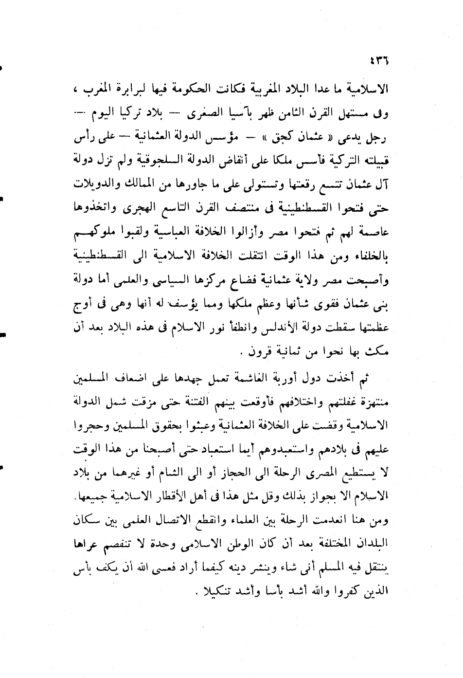الإسلامية ما عدا البلاد المغربية، فكانت الحكومة فيها لبرابرة المغرب، وفي مستهل القرن الثامن ظهر بآسيا الصغرى، بلاد تركيا اليوم -رجل يدعى "عثمان كجق" -مؤسس الدولة العثمانية- على رأس قبيلته التركية، فأسس ملكا على أنقاض الدولة السلجوقية، ولم تزل دولة آل عثمان تتسع رقعتها، وتستولي على ما جاورها من الممالك، والدويلات حتى فتحوا القسطنطينية في منتصف القرن التاسع الهجري، واتخذوها عاصمة لهم، ثم فتحوا مصر وأزالوا الخلافة العباسية، ولقبوا ملوكهم بالخلفاء، ومن هذا الوقت انتقلت الخلافة الإسلامية إلى القسطنطينية، وأصبحت مصر ولاية عثمانية، فضاع مركزها السياسي والعلمي، أما دولة بني عثمان فقوي شأنها وعظم ملكها، ومما يؤسف له أنها وهي في أوج عظمتها سقطت دولة الأندلس، وانطفأ نور الإسلام في هذه البلاد بعد أن مكث بها نحوا من ثمانية قرون.