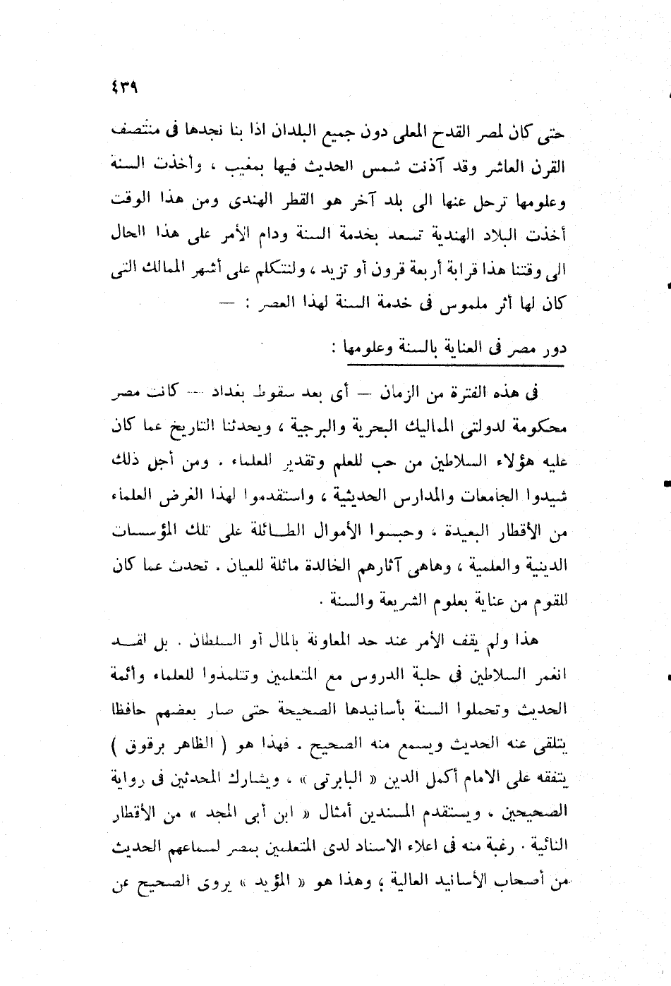 حتى كان لمصر القدح المعلى، دون جميع البلدان إذا بنا نجدها في منتصف القرن العاشر وقد آذنت شمس الحديث فيها بمغيب، وأخذت السنة وعلومها ترحل عنها إلى بلد آخر هو القطر الهندي، ومن هذا الوقت أخذت البلاد الهندية تسعد بخدمة السنة، ودام الأمر على هذا الحال إلى وقتنا هذا قرابة أربعة قرون أو تزيد، ولنتكلم على أشهر الممالك، التي كان لها أثر ملموس في خدمة السنة لهذا العصر: