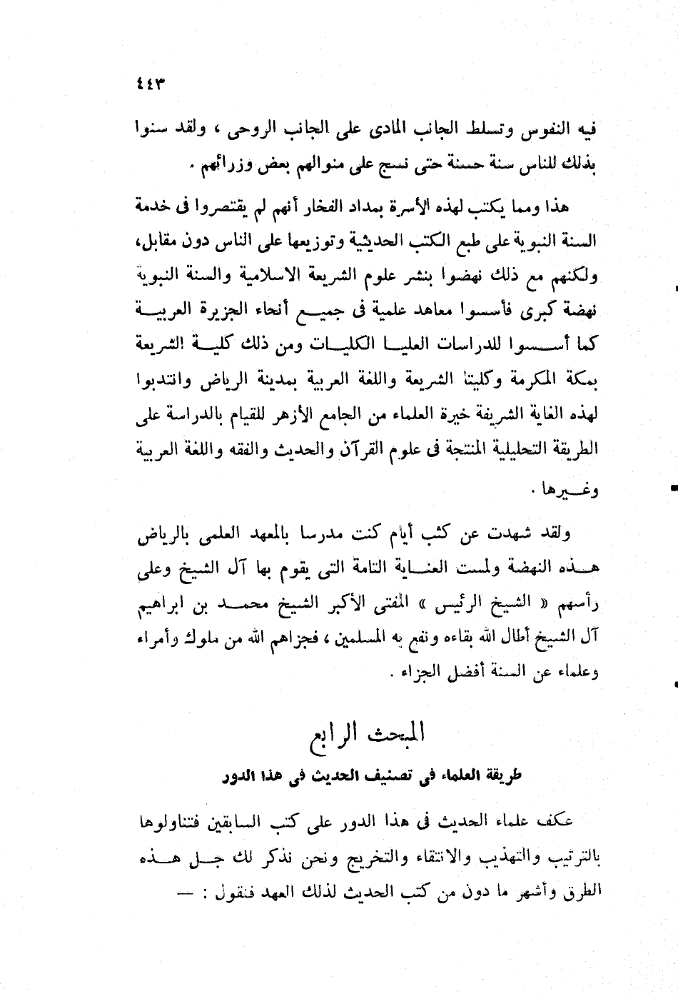 ولقد شهدت عن كثب أيام، كنت مدرسا بالمعهد العلمي بالرياض هذه النهضة، ولمست العناية التامة، التي يقوم بها آل الشيخ، وعلى رأسهم "الشيخ الرئيس"، المفتي الأكبر الشيخ محمد بن إبراهيم آل الشيخ أطال الله بقاءه، ونفع به المسلمين، فجزاهم الله من ملوك وأمراء، وعلماء عن السنة أفضل الجزاء.