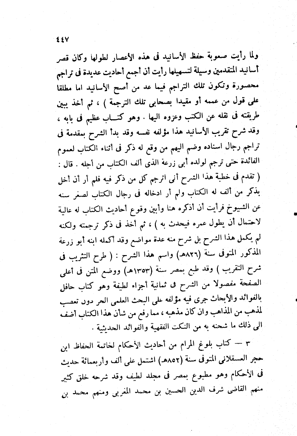 3- كتاب بلوغ المرام من أحاديث الأحكام لخاتمة الحفاظ ابن حجر العسقلاني، المتوفى سنة "852هـ" اشتمل على ألف وأربعمائة حديث في الأحكام، وهو مطبوع بمصر في مجلد لطيف، وقد شرحه خلق كثير منهم القاضي شرف الدين الحسين بن محمد المغربي، ومنهم محمد بن