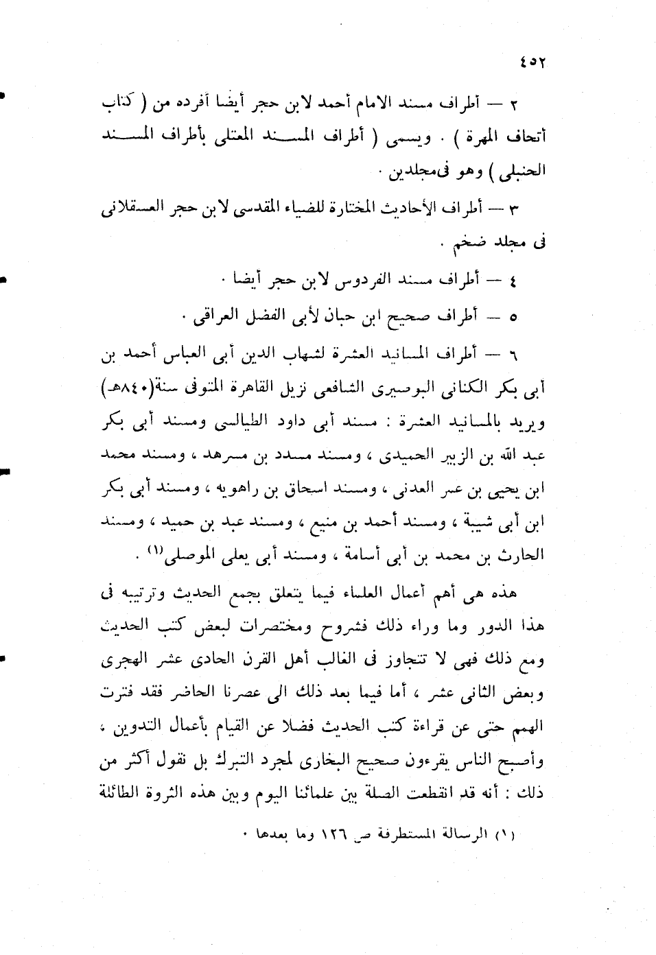 6- أطراف المسانيد العشرة لشهاب الدين أبي العباس، أحمد بن أبي بكر الكناني، البوصيري الشافعي نزيل القاهرة، المتوفى سنة "840هـ"، ويريد بالمسانيد العشرة: مسند أبي داود الطيالسي، ومسند أبي بكر عبد الله بن الزبير الحميدي، ومسند مسدد بن مسرهد، ومسند محمد بن يحيى بن عمر العدني، ومسند إسحاق بن راهويه، ومسند أبي بكر بن أبي شيبة، ومسند أحمد بن منيع، ومسند عبد بن حميد، ومسند الحارث بن محمد بن أبي أسامة، ومسند أبي يعلى الموصلي1.