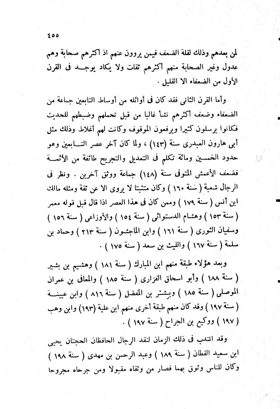وأما القرن الثاني فقد كان في أوائله من أوساط التابعين، جماعة من الضعفاء وضعف أكثرهم نشأ غالبا من قبل تحملهم، وضبطهم للحديث، فكانوا يرسلون كثيرا، ويرفعون الموقوف، وكانت لهم أغلاط وذلك مثل أبي هارون العبدري سنة"143"، ولما كان آخر عصر التابعين، وهو حدود الخمسين ومائة تكلم في التعديل والتجريح طائفة من الأئمة، فضعف الأعمش المتوفى سنة"148" جماعة ووثق آخرين. ونظر في الرجال شعبة "سنة160"، وكان متثبتا لا يروى إلا عن ثقة، ومثله مالك بن أنس "سنة179"، وممن كان في هذا العصر إذا قال قبل قوله معمر "سنة153"، وهشام الدستوائي "سنة154" والأوزاعي "سنة156"، وسفيان الثوري "سنة161"، وابن الماجشون "سنة213"، وحماد بن سلمة "سنة167"، والليث بن سعد "سنة175".