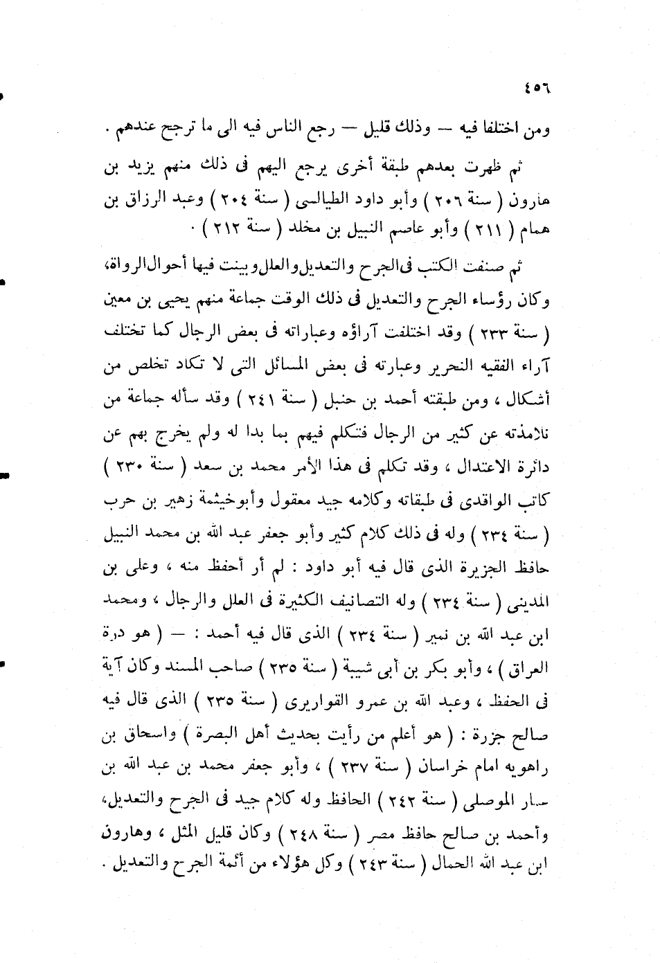 ثم صنفت الكتب في الجرح والتعديل، والعلل وبينت فيها أحوال الرواة، وكان رؤساء الجرح والتعديل في ذلك الوقت جماعة، منهم يحيى بن معين "سنة 233"، وقد اختلف آراؤه وعباراته في بعض الرجال، كما تختلف آراء الفقيه النحرير وعبارته في بعض المسائل، التي لا تكاد تخلص من أشكال، ومن طبقته أحمد بن حنبل "سنة241"، وقد سأله جماعة من تلامذته عن كثير من الرجال، فتكلم فيهم بما بدا له، ولم يخرج بهم عن دائرة الاعتدال، وقد تكلم في هذا الأمر محمد بن سعد "سنة230"، كاتب الواقدي في طبقاته، وكلامه جيد معقول، وأبو خيثمة زهير بن حرب "سنة234"، وله في ذلك كلام كثير، وأبو جعفر عبد الله بن محمد النبيل، حافظ الجزيرة الذي قال فيه أبو داود: لم أر أحفظ منه، وعلي بن المديني "سنة234"، وله التصانيف الكثيرة في العلل والرجال، ومحمد بن عبد الله بن نمير "سنة234" الذي قال فيه أحمد: "هو درة العراق"، وأبو بكر بن أبي شيبة "سنة235"، صاحب السند وكان آية في الحفظ، وعبد الله بن عمرو القواريري "سنة235"، الذي قال فيه صالح جزرة: "هو أعلم من رأيت بحديث أهل البصرة"، وإسحاق بن راهويه إمام خراسان "سنة237"، وأبو جعفر محمد بن عبد الله بن عمار الموصلي "سنة242"، الحافظ وله كلام جيد في الجرح والتعديل، وأحمد بن صالح حافظ مصر "سنة248"، وكان قليل المثل، وهارون بن عبد الله الحمال "سنة243"، وكل هؤلاء من أئمة الجرح والتعديل.