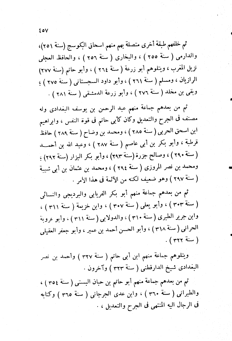 ثم من بعدهم جماعة منهم عبد الرحمن بن يوسف البغدادي، وله مصنف في الجرح والتعديل، وكان كأبي حاتم في قوة النفس، وإبراهيم بن إسحاق الحربي "سنة285"، ومحمد بن وضاح "سنة289" حافظ قرطبة، وأبو بكر بن أبي عاصم "سنة287"، وعبد الله بن أحمد "سنة290"، وصالح جزرة "سنة293"، وأبو بكر البزار "سنة292"، ومحمد بن نصر المروزي "سنة294"، ومحمد بن عثمان بن أبي شيبة "سنة297"، وهو ضعيف لكنه من الأئمة في هذا الأمر.