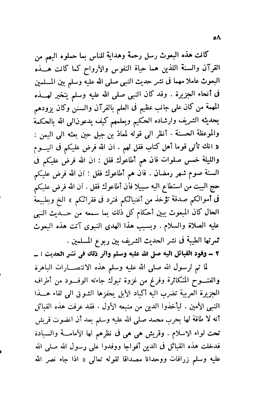"إنك تأتي قوما أهل كتاب فقل لهم: إن الله فرض عليكم في اليوم والليلة خمس صلوات، فإن هم أطاعوك فقل: إن الله فرض عليكم في السنة صوم شهر رمضان، فإن هم أطاعوك فقل: إن الله فرض عليكم حج البيت من استطاع إليه سبيلا، فإن أطاعوك فقل. أن الله فرض عليكم في أموالكم صدقة تؤخذ من أغنيائكم فترد في فقرائكم"، إلخ وبطبيعة الحال كان المبعوث يبين أحكام كل ذلك، بما سمعه من حديث النبي عليه الصلاة والسلام. وبسب هذا الهدي النبوي آتت هذه البعوث ثمرتها الطيبة، في نشر الحديث الشريف بين ربوع المسلمين.