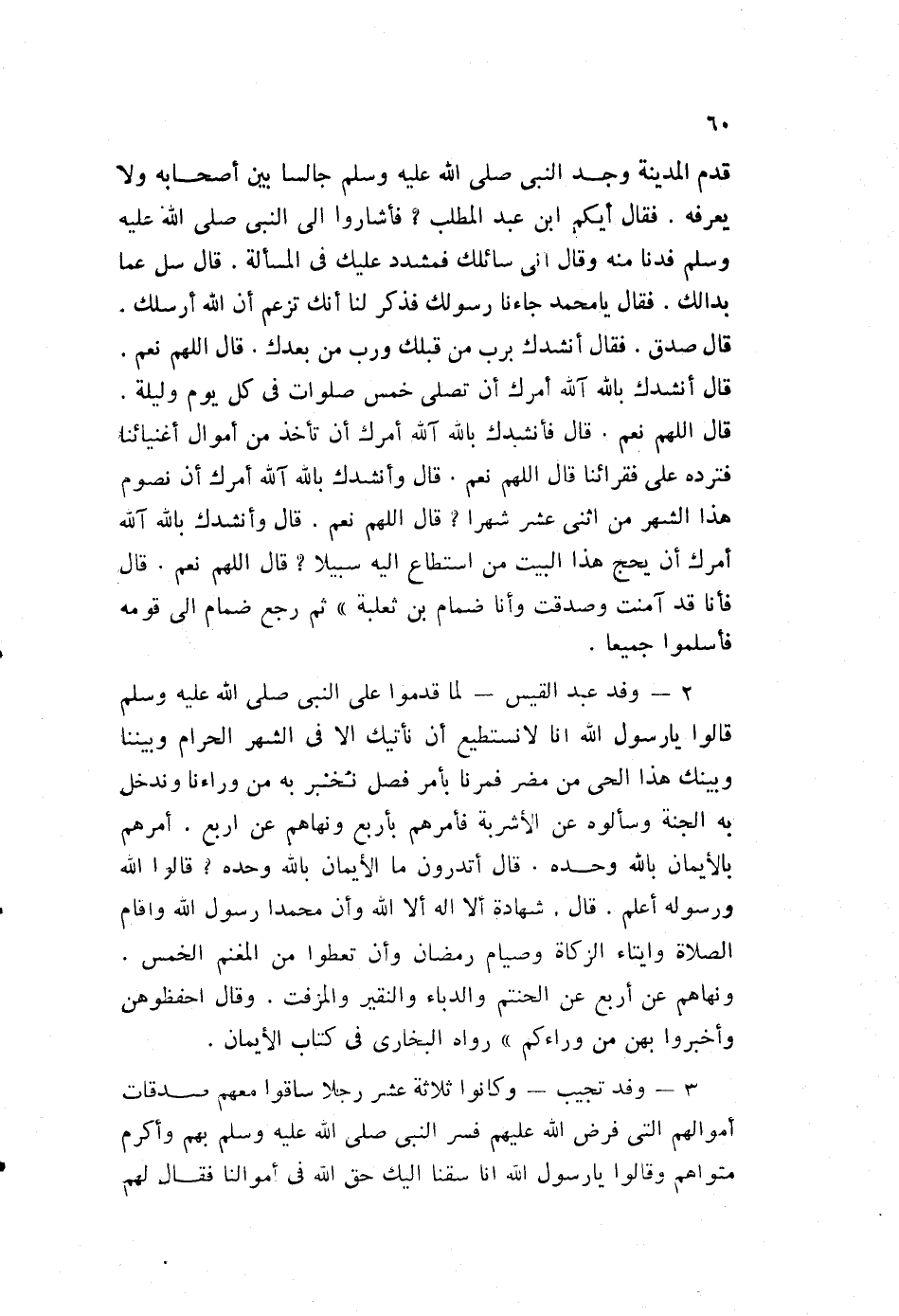 قال: فأنشدك بالله آلله أمرك أن تأخذ من أموال أغنيائنا فترده على فقرائنا؟ قال: "اللهم نعم". قال: وأنشدك بالله آلله أمرك أن نصوم هذا الشهر من اثني عشر شهرا؟ قال: "اللهم نعم". قال: وأنشدك بالله آلله أمرك أن يحج هذا البيت من استطاع إليه سبيلا؟ قال: "اللهم نعم". قال: فأنا قد آمنت وصدقت، وأنا ضمام بن ثعلبة"، ثم رجع ضمام إلى قومه فأسلموا جميعا.
