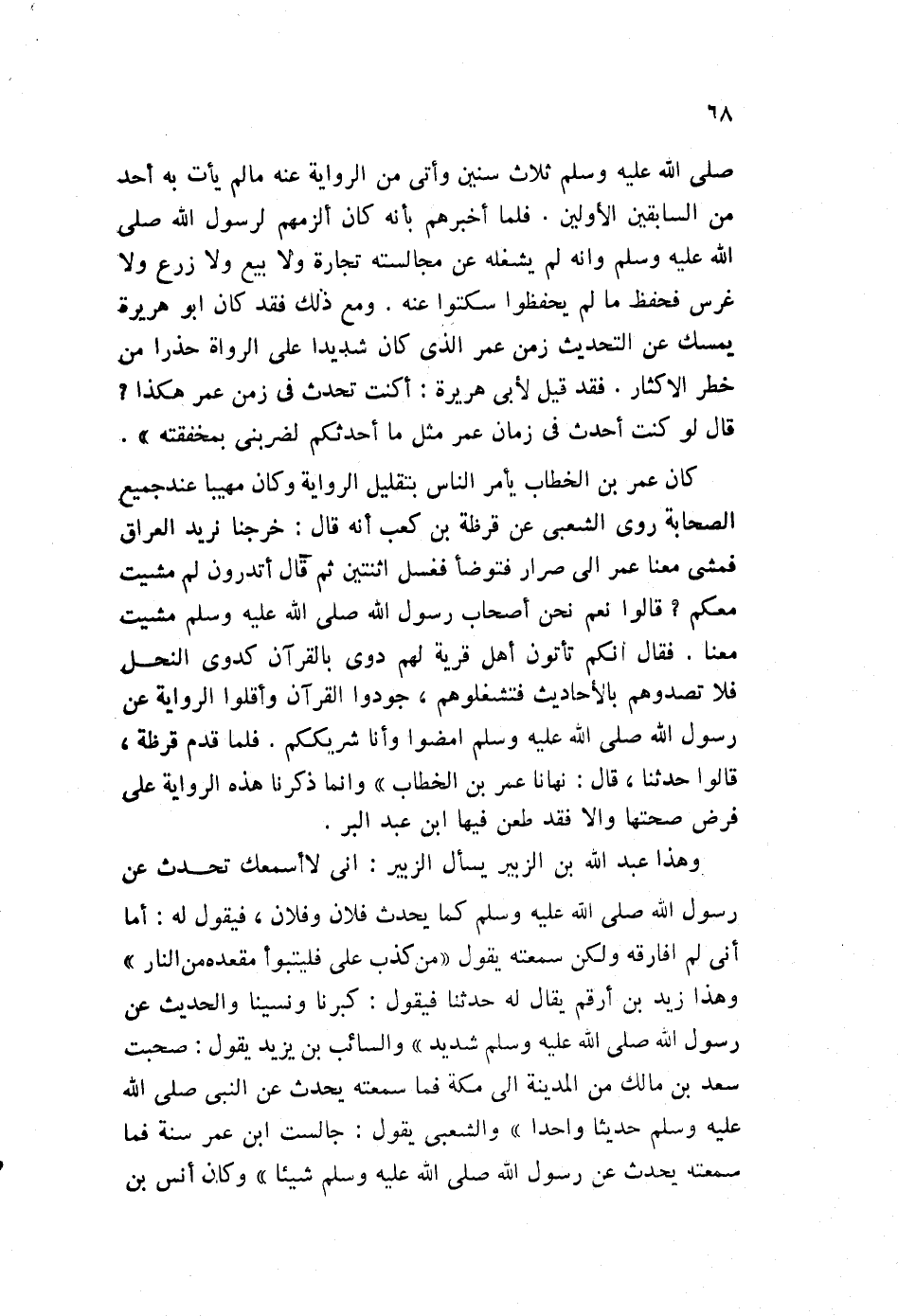 وهذا عبد الله بن الزبير يسأل الزبير: إني لا أسمعك تحدث عن رسول الله صلى الله عليه وسلم كما يحدث فلان وفلان، فيقول له: أما أني لم أفارقه ولكن سمعته يقول: "من كذب علي فليتبوأ مقعده من النار"، وها زيد بن أرقم يقال له حدثنا فيقول: كبرنا ونسينا والحديث عن رسول الله صلى الله عليه وسلم شديد"، والسائب بن يزيد يقول: صحبت سعد بن مالك من المدينة إلى مكة فما سمعته يحدث عن النبي صلى الله عليه وسلم حديثا واحدا"، والشعبي يقول: جالست ابن عمر سنة، فما سمعته يحدث عن رسول الله صلى الله عليه وسلم شيئا"، وكان أنس بن