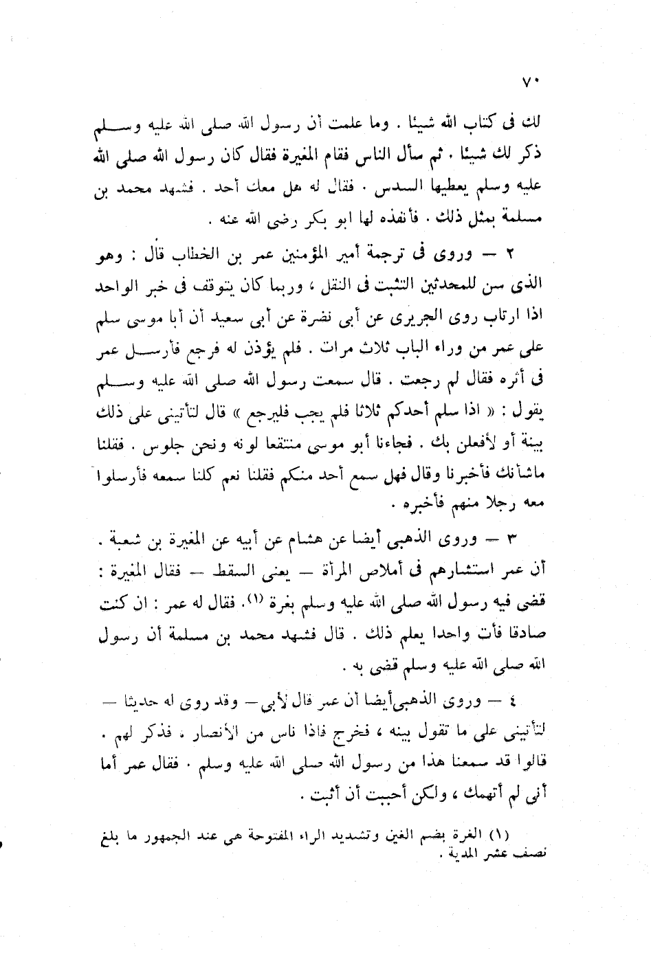 2- وروى في ترجمة أمير المؤمنين عمر بن الخطاب، قال: وهو الذي سن للمحدثين التثبت في النقل، وربما كان يتوقف في خبر الواحد، إذا ارتاب روى الجريري عن أبي نضرة، عن أبي سعيد أن أبا موسى، سلم على عمر من وراء الباب ثلاث مرات. فل يؤذن له فرجع، فأرسل عمر في أثره فقال: لم رجعت. قال: سمعت رسول الله صلى الله عليه وسلم.