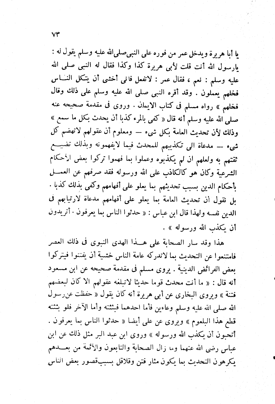 يا رسول الله أنت قلت لأبي هريرة كذا وكذا، فقال له النبي صلى الله عليه وسلم: "نعم"، فقال عمر: لا تفعل فإني أخشى أن يتكل الناس فخلهم يعملون. وقد أقره النبي صلى الله عليه وسلم على ذلك، وقال: "فخلهم"، رواه مسلم في كتاب الإيمان. وروى في مقدمة صحيحه عنه صلى الله عليه وسلم أنه قال: "كفى بالمرء كذبا أن يحدث بكل ما سمع"، وذلك؛ لأن تحديث العامة بكل شيء -ومعلوم أن عقولهم لا تهضم كل شيء- مدعاة إلى تكذيبهم للمحدث فيما لا يفهمونه، وبذلك تضيع ثقتهم به، ولعلهم إن لم يكذبوه، وعملوا بما فهموا تركوا بعض الأحكام الشرعية، وكان هو كالكاذب على الله ورسوله، فقد صرفهم عن العمل بأحكام الدين بسبب تحديثهم بما يعلو على أفهامهم، وكفى بذلك كذبا.