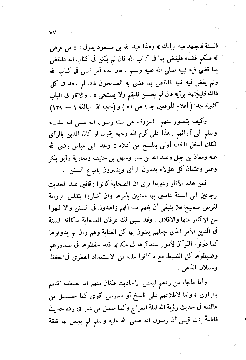 السنة فاجتهد فيه برأيك"، وهذا عبد الله بن مسعود يقول: "من عرض له منكم قضاء فليقض بما في كتاب الله، فإن لم يكن في كتاب الله فليقض بما قضى فيه نبيه صلى الله عليه وسلم. فإن جاء أمر ليس في كتاب الله ولم يقض فيه نبيه، فليقض بما قضى به الصالحون، فإن لم يجد في كل ذلك فليجتهد برأيه فإن لم يحسن فليقم ولا يستحي". والآثار في الباب كثيرة جدا "أعلام الموقعين جـ1 ص51" و"حجة الله البالغة 1-129".