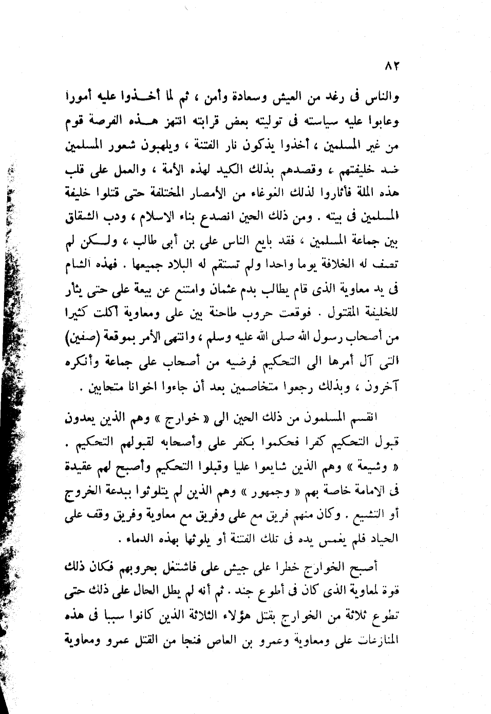 والناس في رغد من العيش وسعادة وأمن، ثم لما أخذوا عليه أمورا وعابوا عليه سياسته في توليته بعض قرابته، انتهز هذه الفرصة قوم من غير المسلمين، أخذوا يذكون نار الفتنة، ويلهبون شعور المسلمين ضد خليفتهم، وقصدهم بذلك الكيد لهذه الأمة، والعمل على قلب هذه الملة، فأثاروا لذلك الغوغاء من الأمصار المختلفة، حتى قتلوا خليفة المسلمين في بيته. ومن ذلك الحين انصدع بناء الإسلام، ودب الشقاق بين جماعة المسلمين، فقد بايع الناس علي بن أبي طالب، ولكن لم تصف له الخلافة يوما واحدا، ولم تستقم له البلاد جميعها. فهذه الشام في يد معاوية الذي قام يطالب بدم عثمان، وامتنع عن بيعة علي حتى يثأر للخليفة المقتول. فوقعت حروب طاحنة بين علي ومعاوية، أكلت كثيرا من أصحاب رسول الله صلى الله عليه وسلم، وانتهى الأمر بموقعة "صفين" التي آل أمرها إلى التحكيم فرضيه من أصحاب علي جماعة، وأنكره آخرون، وبذلك رجعوا متخاصمين بعد أن جاءوا إخوانا متحابين.