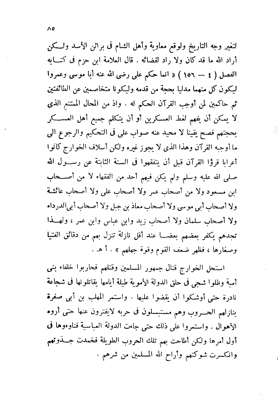 لتغير وجه التاريخ ولوقع معاوية وأهل الشام في براثن الأسد، ولكن أراد الله ما قد كان ولا راد لقضائه. قال العلامة ابن حزم في كتابه الفصل "4-156" "إنما حكم علي رضي الله عنه أبا موسى، وعمروا ليكون كل منهما مدليا بحجة من قدمه، وليكونا متخاصمين عن الطائفتين، ثم حاكمين لمن أوجب القرآن الحكم له. وإذ من المحال الممتنع الذي لا يمكن أن يفهم لغط العسكريين، أو أن يتكلم جميع أهل العسكر بحجتهم، فصح يقينا لا محيد عنه صواب علي في التحكيم، والرجوع إلى ما أوجبه القرآن، وهذا الذي لا يجوز غيره، ولكن أسلاف الخوارج، كانوا أعرابا قرءوا القرآن قبل أن يتفقهوا في السنة الثابتة عن رسول الله صلى الله عليه وسلم، ولم يكن فيهم أحد من الفقهاء، لا من أصحاب ابن مسعود ولا من أصحاب عمر، ولا أصحاب علي، ولا أصحاب عائشة، ولا أصحاب أبي موسى، ولا أصحاب معاذ بن جبل، ولا أصحاب أبي الدرداء، ولا أصحاب سلمان، ولا أصحاب زيد وابن عباس وابن عمر، ولهذا تجدهم يكفر بعضهم بعضا عند أقل نازلة، تنزل بهم من دقائق الفتيا وصغارها، فظهر ضعف القوم وقوة جهلهم". ا. هـ.