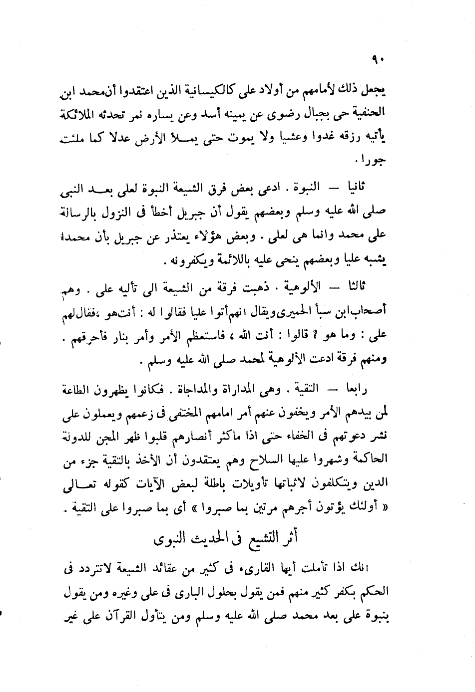 ثانيا: النبوة ادعى بعض فرق الشيعة النبوة لعلي بعد النبي صلى الله عليه وسلم، وبعضهم يقول أن جبريل، أخطأ في النزول بالرسالة على محمد، وإنما هي لعلي، وبعض هؤلاء يعتذر عن جريل بأن محمد يشبه عليا، وبعضهم ينحى عليه باللائمة ويكفرونه.