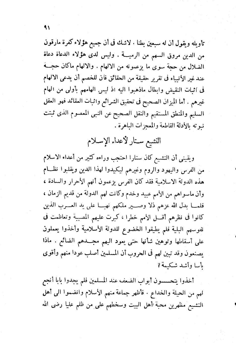 تأويله ويقول: أن له سبعين بطنا. لا شك في أن جميع هؤلاء كفرة، مارقون من الدين مروق السهم من الرمية. وليس لدى هؤلاء الدعة دعاة الضلال من حجة سوى ما يزعمونه من الإلهام. والإلهام ما كان حجة عند غير الأنبياء في تقرير حقيقة من الحقائق، فإن للخصم أن يدعي الإلهام في إثبات النقيض، وإبطال ما ذهبوا إليه، إذ ليس إلهامهم بأولى من إلهام غيرهم. أما الميزان الصحيح في تحقيق الشرائع، وإثبات العقائد فهو العقل السليم، والمنطق المستقيم، والنقل الصحيح عن النبي المعصوم، الذي ثبتت نبوته بالأدلة القاطعة، والمعجزات الباهرة.