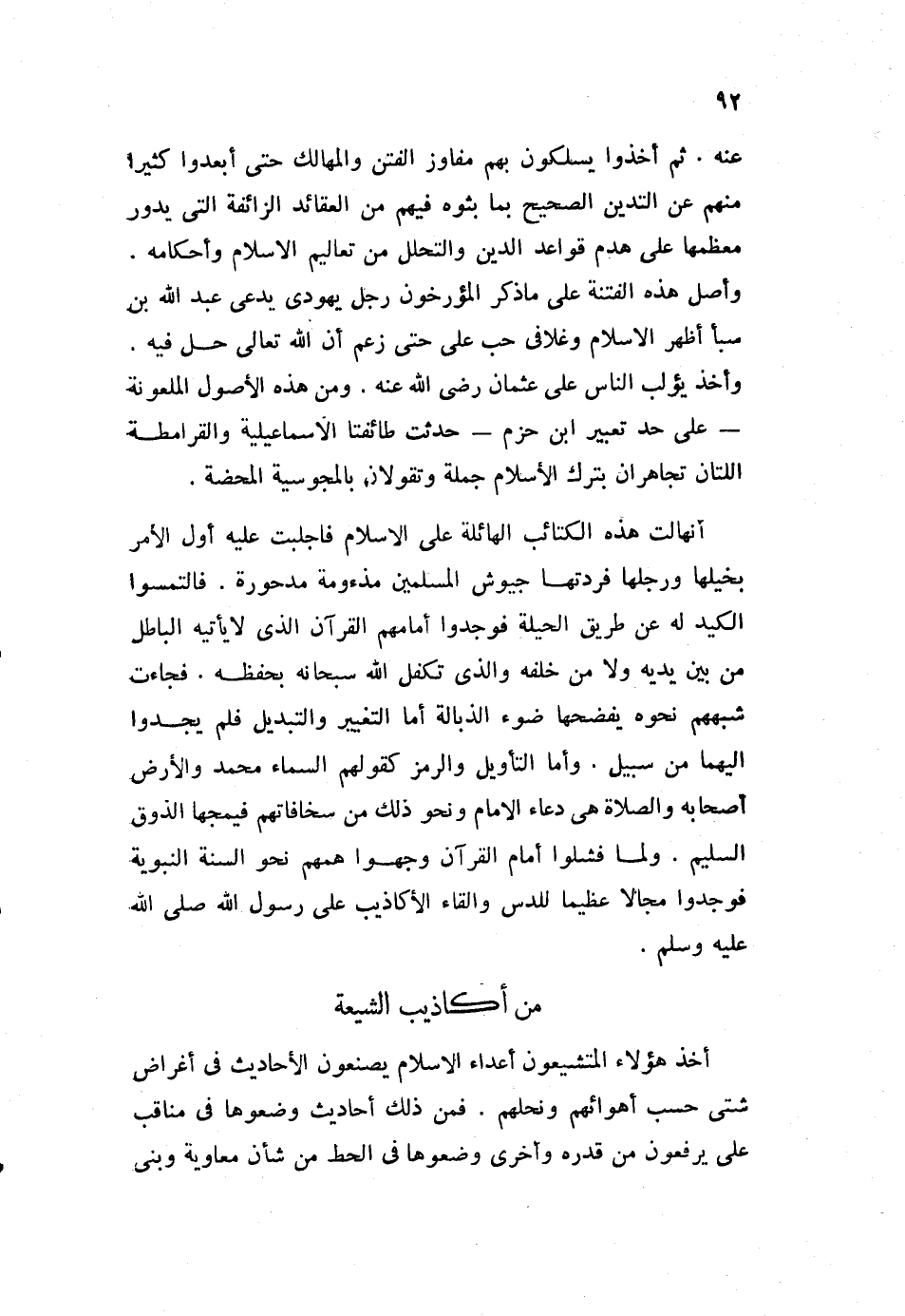 انهالت هذه الكتائب الهائلة على الإسلام، فأجلبت عليه أول الأمر خيلها، ورجلها فردتها جيوش المسلمين مذءومة مدحورة. فالتمسوا الكيد له عن طريق الحيلة، فوجدوا إمامهم القرآن، الذي لا يأتيه الباطل من بين يديه، ولا من خلفه، والذي تكفل الله سبحنه بحفظه. فجاءت شبههم نحو يفضحها ضوء الذبالة، أما التغيير والتبديل، فلم يجدوا إليهما من سبيل، وأما التأويل والرمز كقولهم السماء محمد، والأرض أصحابه والصلاة هي دعاء الإمام، ونحو ذلك من سخافاتهم فيمجها الذوق السليم. ولما فشلوا أمام القرآن، وجهوا همهم نحو السنة النبوية، فوجدوا مجالا عظيما للدس، وإلقاء الأكاذيب على رسول الله صلى الله عليه وسلم.