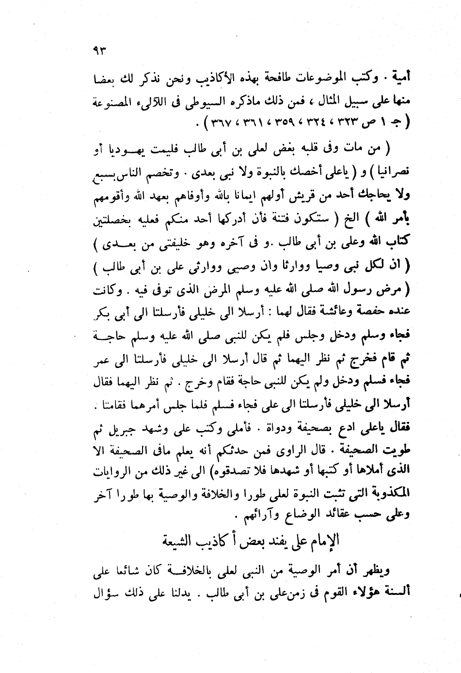 فقال: يا علي ادع بصحيفة ودواة. فأملى وكتب علي، وشهد جبريل ثم طويت الصحيفة. قال الراوي: فمن حدثكم أنه يعلم ما في الصحيفة إلا الذي أملاها أو كتبها أو شهدها، فلا تصدقوه"، إلى غير ذلك من الروايات المكذوبة التي تثبت النبوة لعلي طورا، والخلافة والوصية بها طورا آخر، وعلى حسب عقائد الوضاع وآرائهم.