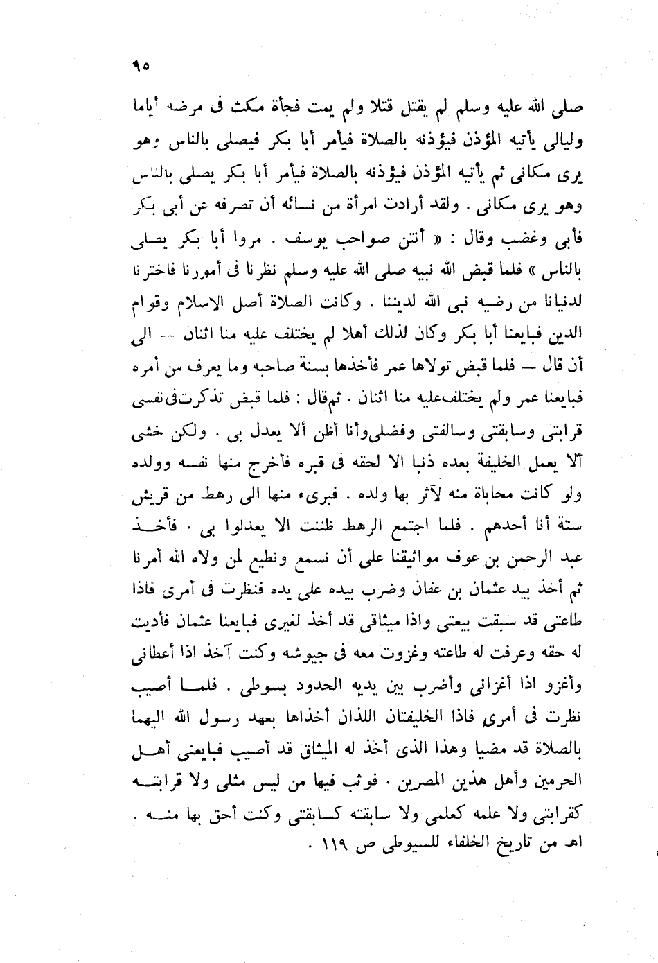 صلىالله عليه وسلم لم يقتل قتلا، ولم يمت فجأة مكث في مرضه أياما، وليالي يأتيه المؤذن، فيؤذنه بالصلاة، فيأمر أبا بكر فيصلي بالناس، وهو يرى مكاني ثم يأتيه المؤذن، فيؤذنه بالصلاة، فيأمر أبا بكر يصلي بالناس، وهو يرى مكاني. ولقد أرادت امرأة من نسائه، أن تصرفه عن أبي بكر فأبى وغضب وقال: "أنتن صواحب يوسف. مروا أبا بكر يصلي بالناس"، فلما قبض الله نبيه صلى الله عليه وسلم، نظرنا في أمورنا، فاخترنا لدنيانا من رضيه نبي الله لديننا. وكانت الصلاة أصل الإسلام، وقوام الدين فبايعنا أبا بكر، وكان لذلك أهلا لم يختلف عليه منا اثنان -إلى أن قال- فلما قبض تولاها عمر، فأخذها بسنة صاحبه وما يعرف من أمره فبايعنا عمر، ولم يختلف عليه منا اثنان. ثم قال: فلما قبض تذكرت في نفسي قرابتي، وسابقتي وسالفتي وفضلي، وأنا أظن ألا يعدل بي. ولكن خشي ألا يعمل الخليفة بعده ذنبا، إلا لحقه في قبره، فأخرج منها نفسه وولده، ولو كانت محاباة منه لآثر بها ولده. فبرئ منها إلى رهط من قريش ستة أنا أحدهم. فلما اجتمع الرهط ظننت ألا يعدلوا بي. فأخذ عبد الرحمن بن عوف مواثيقنا على أن نسمع، ونطيع لمن ولاه الله أمرنا، ثم أخذ بيد عثمان بن عفان، وضرب بيده على يده، فنظرت في أمري فإذا طاعتي قد سبقت بيعتي، وإذا ميثاقي قد أخذ لغيري، فبايعنا عثمان فأديت له حقه، وعرفت له طاعته، وغزوت معه في جيوشه، وكنت آخذ إذا أعطاني، وأغزو إذا أغزاني، وأضرب بين يديه الحدود بسوطي. فلما أصيب نظرت في أمري، فإذا الخليفتان اللذان أخذاها بعهد رسول الله إليهما بالصلاة قد مضيا، وهذا الذي أخذ له الميثاق قد أصيب فبايعين أهل الجرمين، وأهل هذين المصرين. فوثب فيها من ليس مثلي، ولا قرابته كقرابتي، ولا علمه كعلمي ولا سابقته كسابقتي، وكنت أحق بها منه.