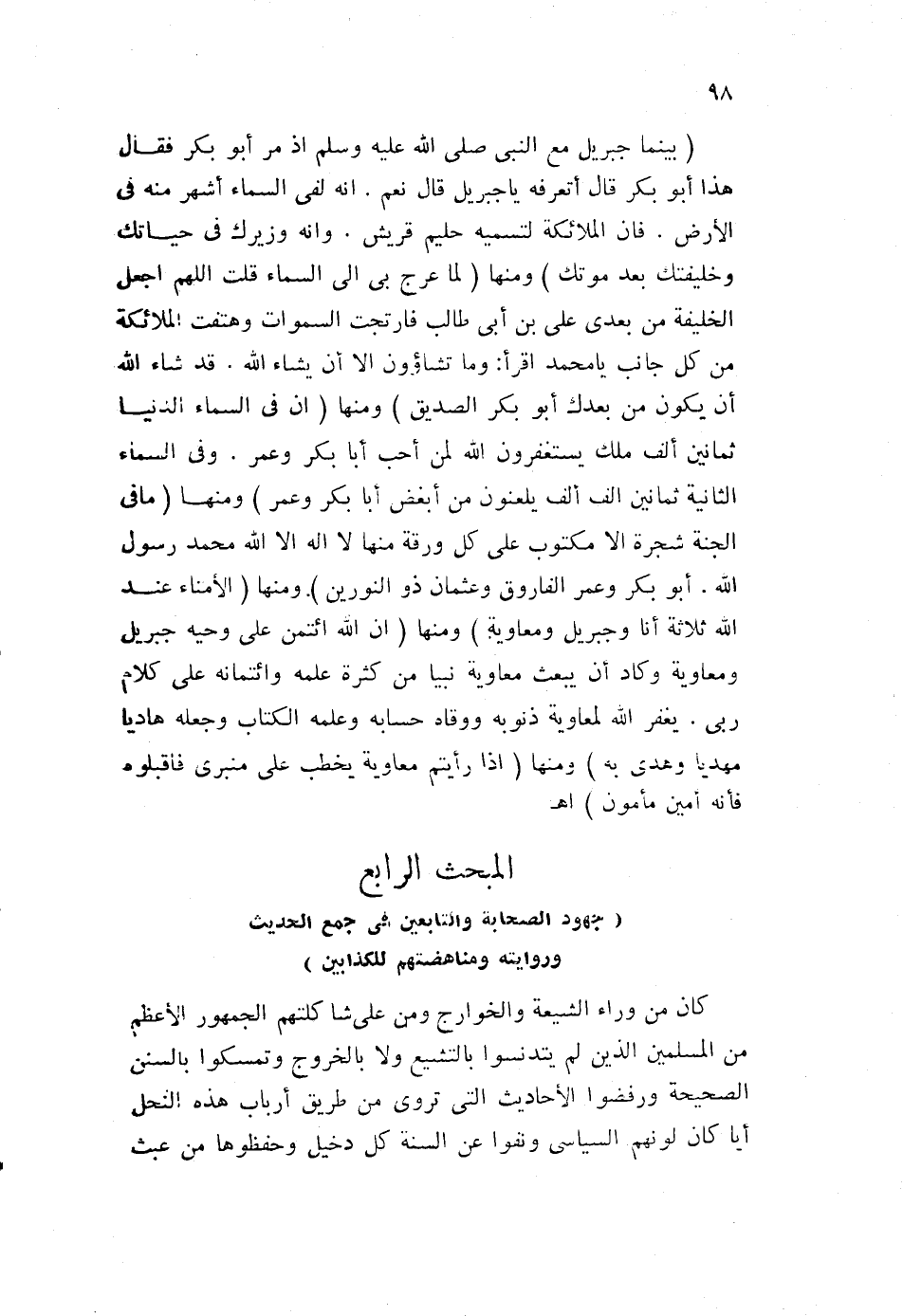 "بينما جبريل مع النبي صلى الله عليه وسلم، إذ مر أبو بكر فقال: هذا أبو بكر قال: أتعرفه يا جبريل قال: نعم. أنه لفي السماء أشهر منه في الأرض. فإن الملائكة لتسميه حليم قريش. وإنه وزيرك في حياتك، وخليفتك بعد موتك"، ومنها "لما عرج بي إلى السماء، قلت: اللهم اجعل الخليفة من بعدي علي بن أبي طالب، فارتجت السموات، وهتفت الملائكة من كل جانب يا محمد اقرأ: {وَمَا تَشَاءُونَ إِلَّا أَنْ يَشَاءَ اللَّه} ، قد شاء الله أن يكون من بعدك أبو بكر الصديق"، ومنها "إن في السماء الدنيا ثمانين ألف ملك، يستغفرون الله لمن أحب أبا بكر وعمر. وفي السماء الثانية ثانين ألف ألف يلعنون من أبغض أبا بكر وعمر"، ومنها "ما في الجنة شجرة إلا مكتوب على كل ورقة منها لا إله إلا الله محمد رسول الله. أبو بكر وعمر الفاروق، وعثمان ذو النورين"، ومنها "الأمناء عند الله ثلاثة أنا وجبريل ومعاوية"، ومنها "إن الله ائتمن على وحيه جبريل، ومعاوية وكاد أن يبعث معاوية نبيا من كثرة علمه، وائتمانه على كلام ربي. يغفر الله لمعاوية ذنوبه، ووقاه حسابه وعلمه الكتاب، وجعله هاديا مهديا وهدى به"، ومنها "إذا رأيتم معاوية يخطب على منبري، فاقبلوها فإنه أمين مأمون". ا. هـ.