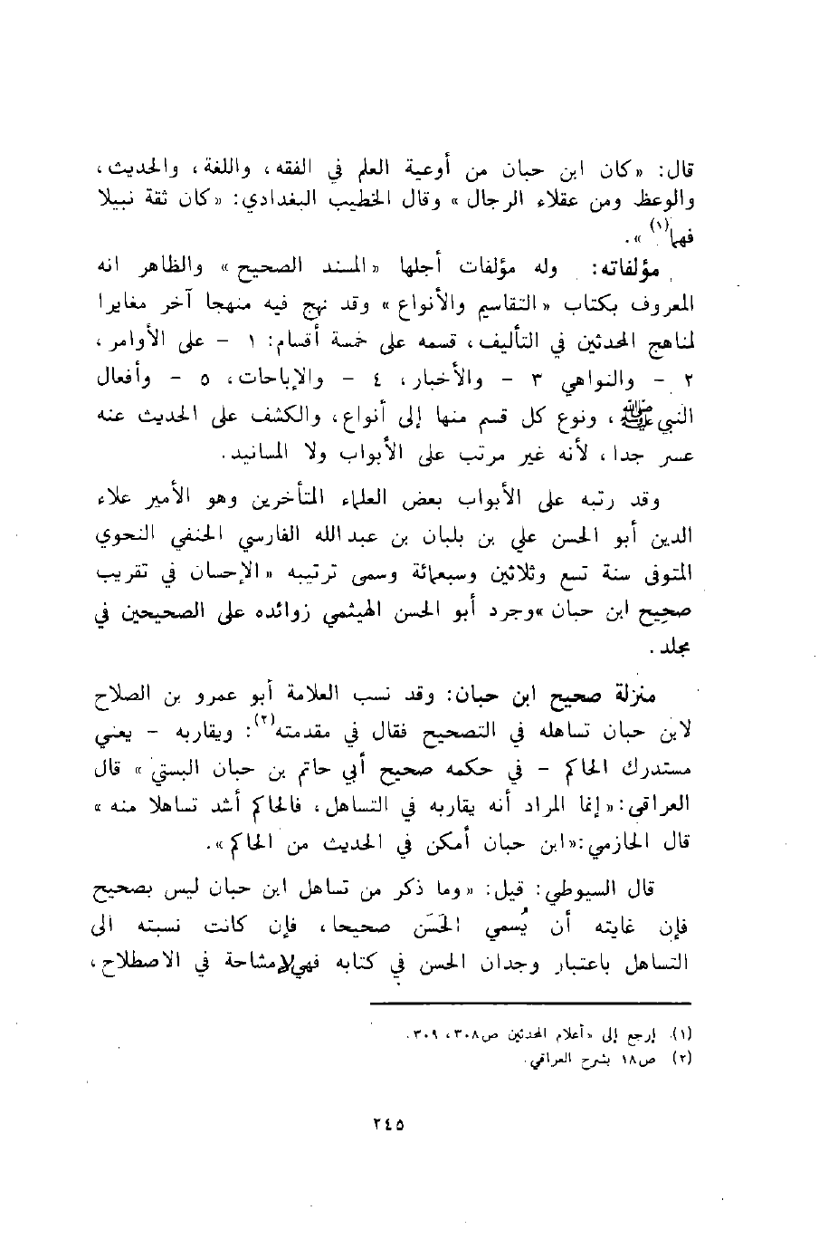 منزلة صحيح ابن حبان: وقد نسب العلامة أبو عمرو بن الصلاح؛ لابن حبان تساهله في التصحيح فقال في مقدمته2: ويقاربه -يعني مستدرك الحاكم- في حكمه صحيح أبي حاتم بن حبان البستي". قال العراقي: "إنما المراد أنه يقاربه في التساهل، فالحاكم أشد تساهلا منه". قال الحازمي: "ابن حبان أمكن في الحديث من الحاكم".