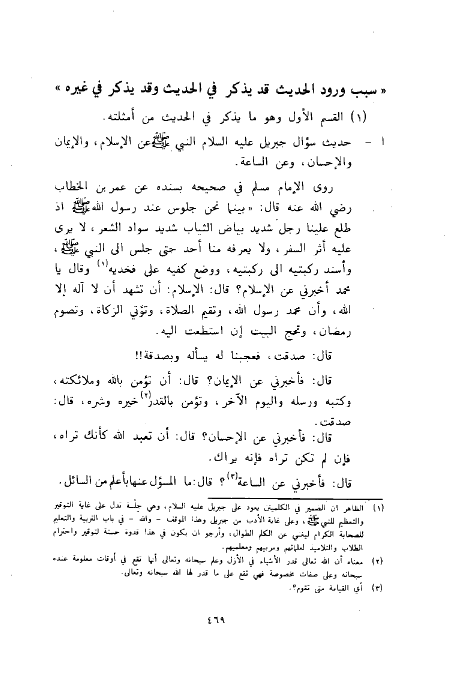 1- حديث سؤال جبريل عليه السلام النبي -صلى الله عليه وسلم- عن الإسلام، والإيمان والإحسان، وعن الساعة.