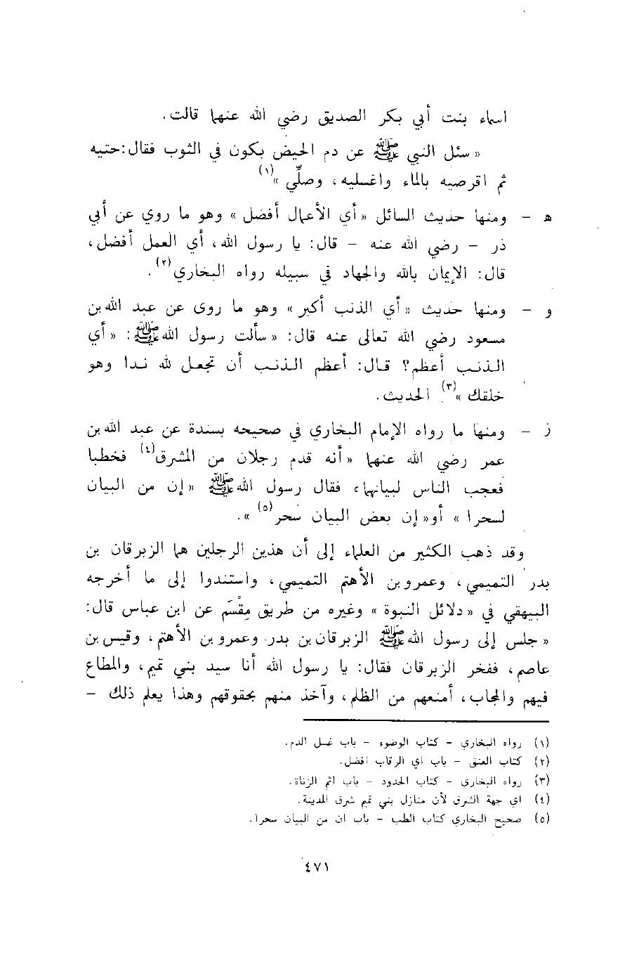 ز- ومنها ما رواه الإمام البخاري في صحيحه بسنده عن عبد الله بن عمر رضي الله عنهما "أنه قدم رجلان من المشرق4 فخطبا فعجب الناس لبيانهما، فقال رسول الله -صلى الله عليه وسلم: "إن من البيان لسحرا" أو: "إن بعض البيان سحر" 5.