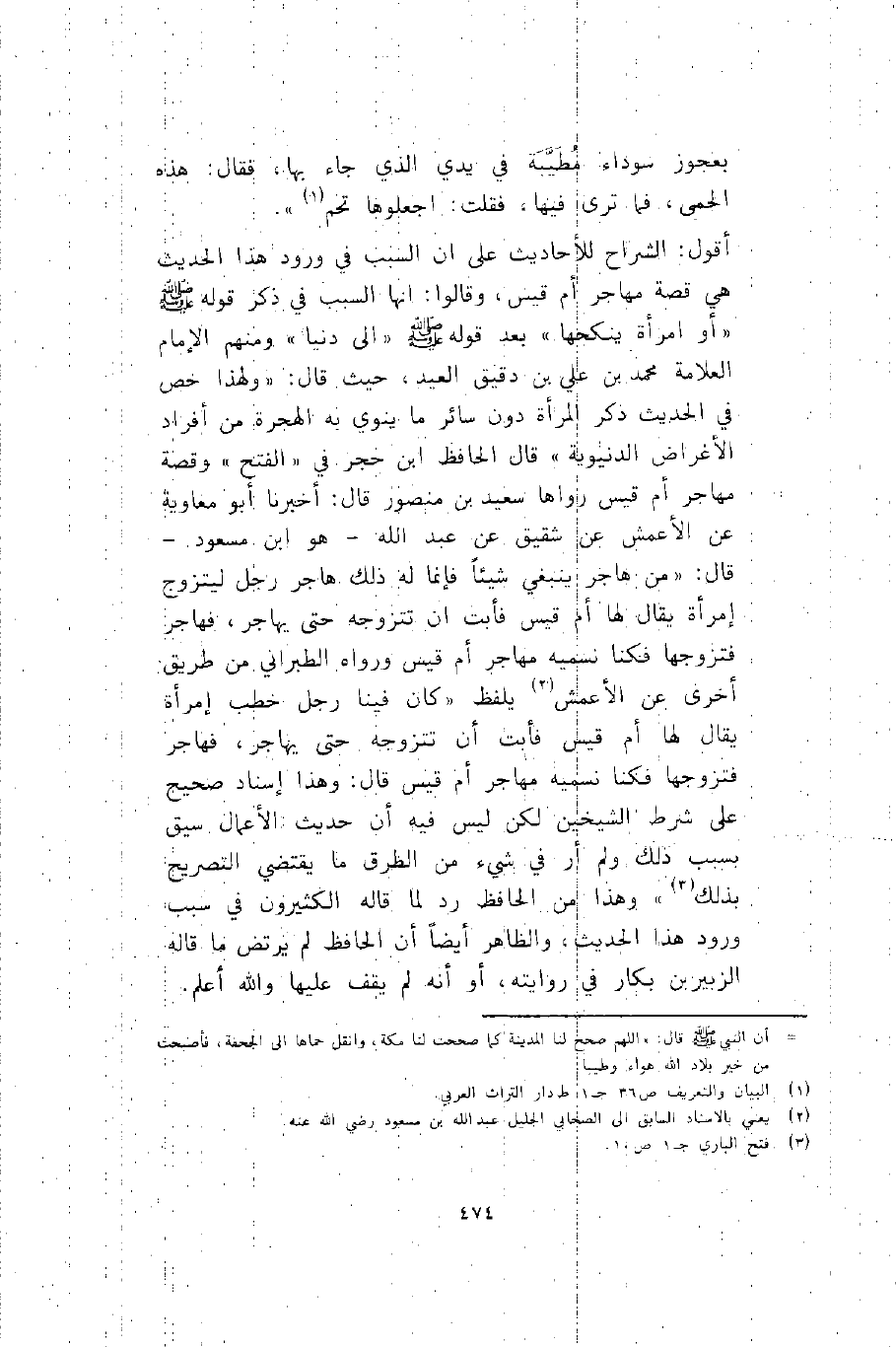 أقول: الشراح للأحاديث على أن السبب في ورود هذا الحديث هي قصة مهاجر أم قيس، وقالوا: إنها السبب في ذكر قوله -صلى الله عليه وسلم: "أو امرأة ينكحها" بعد قوله -صلى الله عليه وسلم: "إلى دنيا" , ومنهم الإمام العلامة محمد بن علي بن دقيق العيد، حيث قال: "ولهذا خص في الحديث ذكر المرأة دون سائر ما ينوى به الهجرة من أفراد الأغراض الدنيوية", قال الحافظ ابن حجر في "الفتح" وقصة مهاجر أم قيس رواها سعيد بن منصور قال: أخبرنا أبو معاوية عن الأعمش عن شقيق عن عبد الله -هو ابن مسعود- قال: من هاجر ينبغي شيئا, فإنما له ذلك هاجر رجل ليتزوج امرأة يقال لها أم قيس فأبت أن تتزوجه حتى يهاجر، فهاجر فتزوجها فكنا نسميه مهاجر أم قيس. ورواه الطبراني من طريق أخرى عن الأعمش2 بلفظ: كان فينا رجل خطب امرأة يقال لها أم قيس فأبت أن تتزوجه حتى يهاجر، فهاجر فتزوجها فكنا نسميه مهاجر أم قيس. قال: وهذا إسناد صحيح على شرط الشيخين لكن ليس فيه أن حديث الأعمال سيق بسبب ذلك, ولم أر في شيء من الطرق ما يقتضي التصريح بذلك"3, وهذا من الحافظ رد لما قاله الكثيرون في سبب ورود هذا الحديث، والظاهر أيضا أن الحافظ لم يرتض ما قاله الزبير بن بكار في روايته، أو أنه لم يقف عليها والله أعلم.