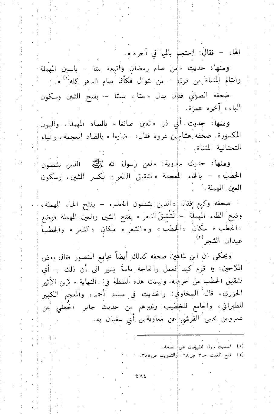 ومنها: حديث معاوية: لعن رسول الله -صلى الله عليه وسلم- الذين يشققون الخطب -بالخاء المعجمة- تشقيق الشعر -بكسر الشين، وسكون العين المهملة.