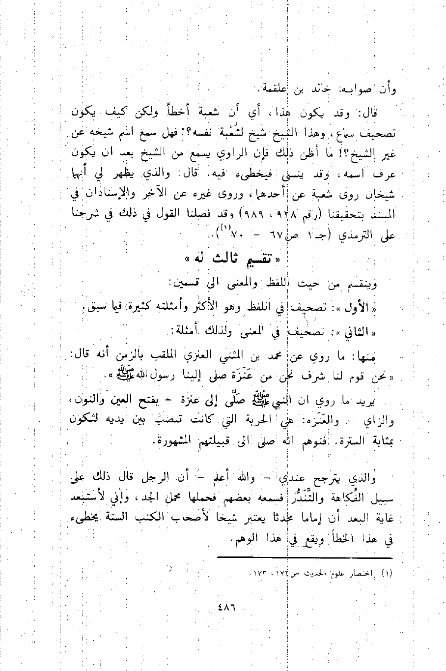 قال: وقد يكون هذا، أي أن شعبة أخطأ, ولكن كيف يكون تصحيف سماع, وهذا الشيخ شيخ لشعبة نفسه؟! فهل سمع اسم شيخه عن غير الشيخ؟! ما أظن ذلك فإن الراوي يسمع من الشيخ بعد أن يكون عرف اسمه، وقد ينسى فيخطئ فيه. قال: والذي يظهر لي أنهما شيخان روى شعبة عن أحدهما، وروى غيره عن الآخر والإسنادان في المسند بتحقيقنا "رقم 928، 989" وقد فصلنا القول في ذلك في شرحنا على الترمذي "ج1 ص67-70"1.