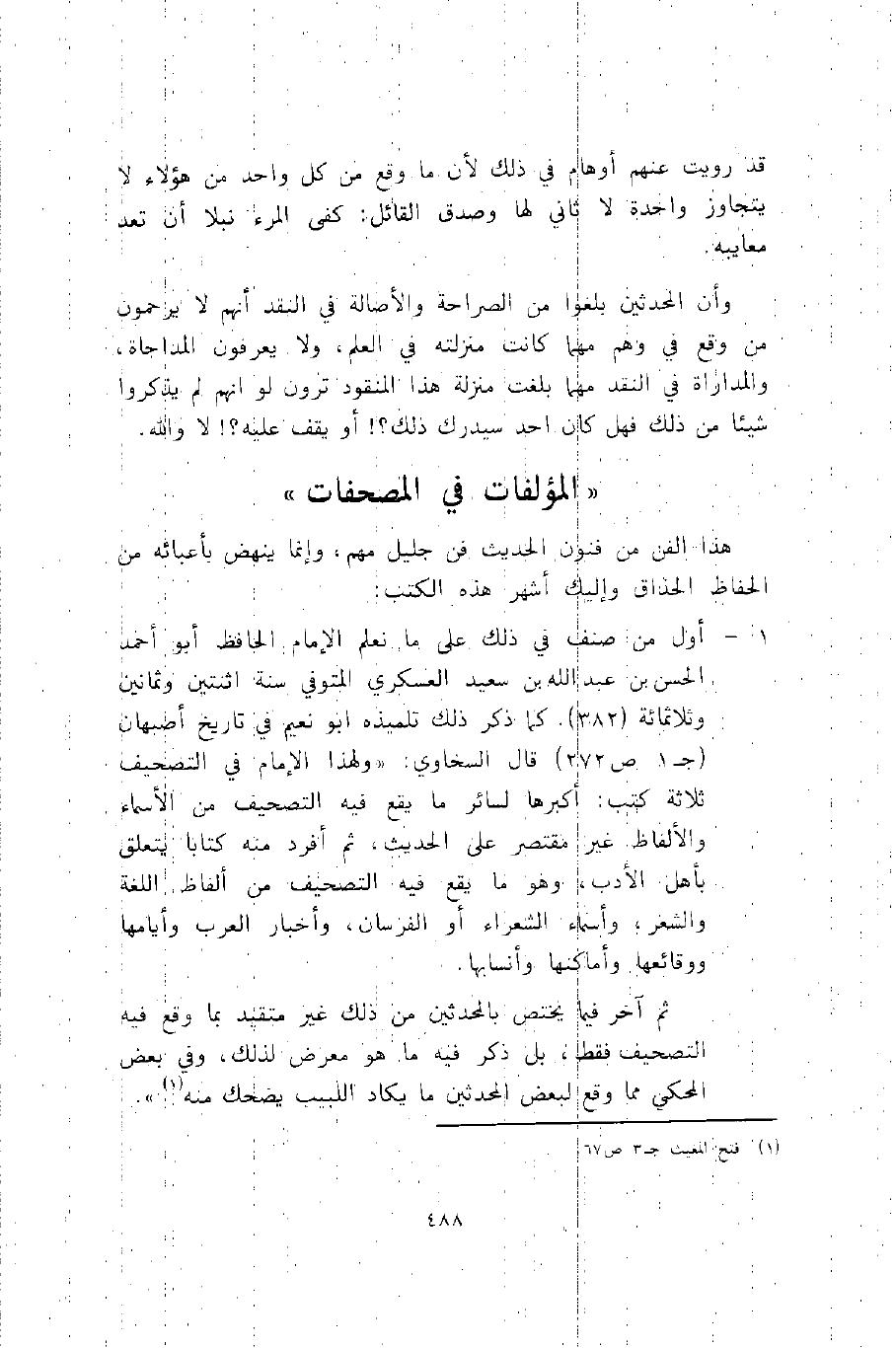 ثم آخر فيما يختص بالمحدثين من ذلك غير متقيد بما وقع فيه التصحيف فقط، بل ذكر فيه ما هو معرض لذلك، وفي بعض المحكي مما وقع لبعض المحدثين ما يكاد اللبيب يضحك منه1.