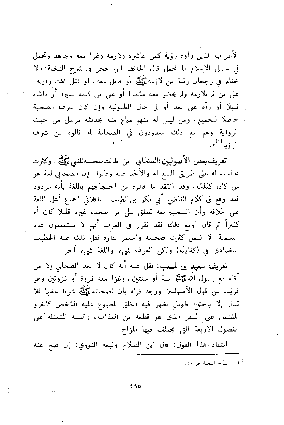تعريف سعيد بن المسيب: نقل عنه أنه كان لا يعد الصحابي إلا من أقام مع رسول الله -صلى الله عليه وسلم- سنة أو سنتين، وغزا معه غزوة أو غزوتين, وهو قريب من قول الأصوليين ووجه قوله بأن لصحبته -صلى الله عليه وسلم- شرفا عظيما فلا تنال إلا باجتماع طويل يظهر فيه الخلق المطبوع عليه الشخص كالغزو المشتمل على السفر الذي هو قطعة من العذاب، والسنة المتمثلة على الفضول الأربعة التي يختلف فيها المزاج.