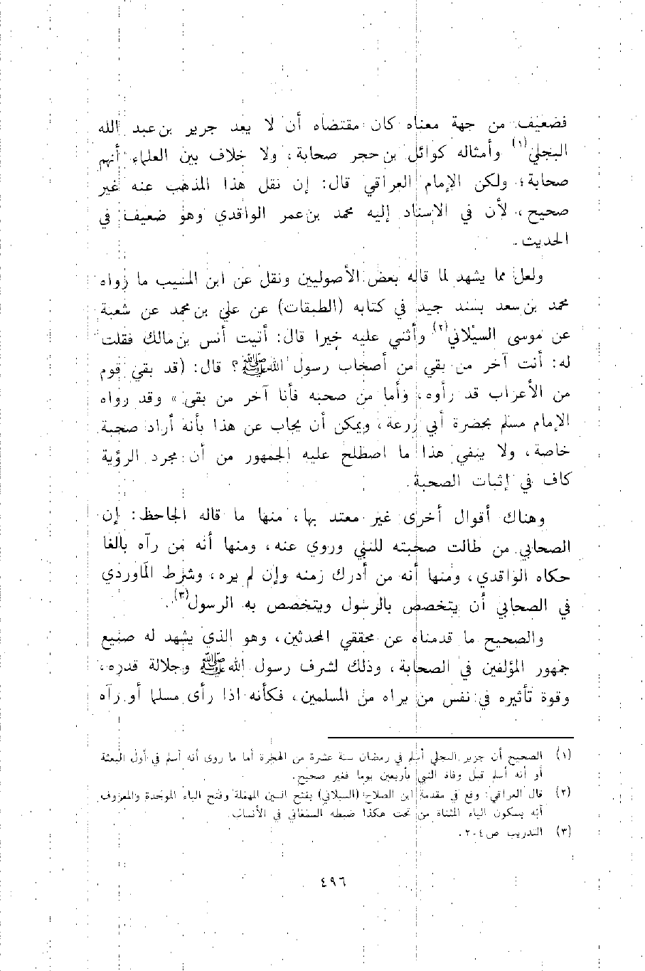 ولعل مما يشهد لما قاله بعض الأصوليين, ونقل عن ابن المسيب ما رواه محمد بن سعيد بسند جيد في كتابه "الطبقات" عن علي بن محمد عن شعبة عن موسى السيلاني2, وأثنى عليه خيرًا قال: أتيت أنس بن مالك فقلت له: أنت آخر من بقي من أصحاب رسول الله -صلى الله عليه وسلم؟ قال: "قد بقي قوم من الأعراب قد رأوه، وأما من صحبه فأنا آخر من بقي", وقد رواه الإمام مسلم بحضرة أبي زرعة، ويمكن أن يجاب عن هذا بأنه أراد صحبة خاصة، ولا ينفي هذا ما اصطلح عليه الجمهور من أن مجرد الرؤية كاف في إثبات الصحبة.
