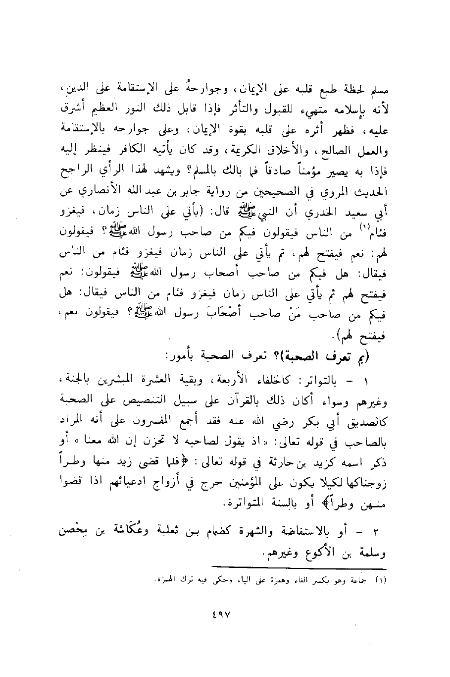 مسلم لحظة طبع قلبه على الإيمان، وجوارحه على الاستقامة على الدين؛ لأنه بإسلامه متهيئ للقبول والتأثر, فإذا قابل ذلك النور العظيم أشرق عليه، فظهر أثره على قلبه بقوة الإيمان، وعلى جوارحه بالاستقامة والعمل الصالح، والأخلاق الكريمة، وقد كان يأتيه الكافر, فينظر إليه فإذا به يصير مؤمنا صادقا, فما بالك بالمسلم؟ ويشهد لهذا الرأي الراجح الحديث المروي في الصحيحين من رواية جابر بن عبد الله الأنصاري عن أبي سعيد الخدري أن النبي -صلى الله عليه وسلم- قال: "يأتي على الناس زمان، فيغزو فئام 1 من الناس, فيقولون: فيكم من صاحب رسول الله -صلى الله عليه وسلم؟ فيقولون لهم: نعم فيفتح لهم، ثم يأتي على الناس زمان فيغزو فئام من الناس, فيقال: هل فيكم من صاحب أصحاب رسول الله -صلى الله عليه وسلم؟ فيقولون لهم: نعم فيفتح لهم, ثم يأتي على الناس زمان فيغزو فئام من الناس, فيقال: هل فيكم من صاحب من صاحب أصحاب رسول الله -صلى الله عليه وسلم؟ فيقولون: نعم، فيفتح لهم".