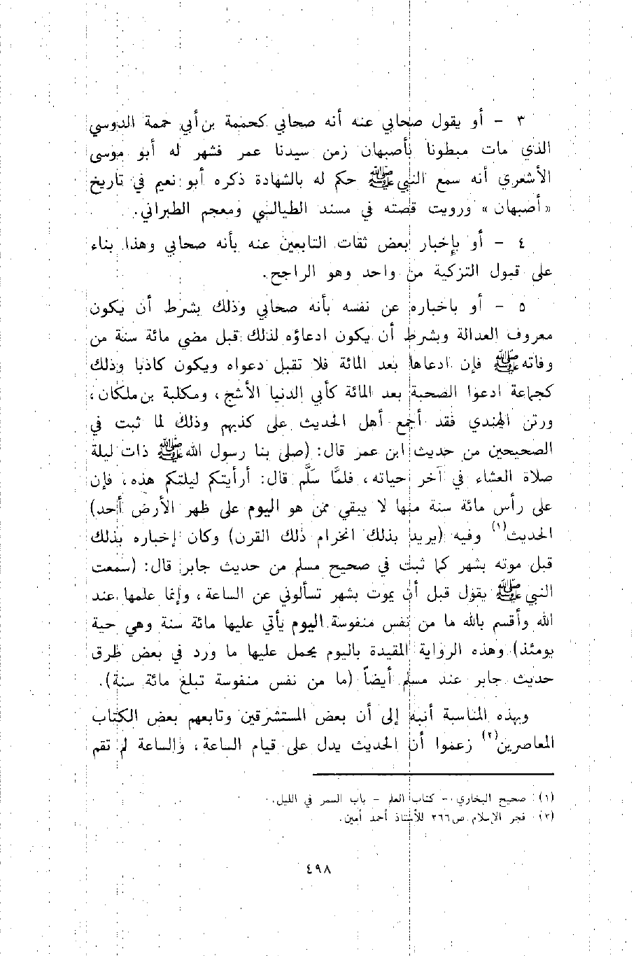 5- أو بإخباره عن نفسه بأنه صحابي, وذلك بشرط أن يكون معروف العدالة وبشرط أن يكون ادعاؤه لذلك قبل مضي مائة سنة من وفاته -صلى الله عليه وسلم- فإن ادعاها بعد المائة, فلا تقبل دعواه ويكون كاذبا وذلك كجماعة ادعوا الصحبة بعد المائة كأبي الدنيا الأشج، ومكلبة بن ملكان، ورتن الهندي, فقد أجمع أهل الحديث على كذبهم, وذلك لما ثبت في الصحيحين من حديث ابن عمر قال: صلى بنا رسول الله -صلى الله عليه وسلم- ذات ليلة صلاة العشاء في آخر حياته، فلما سلم قال: "أرأيتكم ليلتكم هذه، فإن على رأس مائة سنة منها لا يبقى ممن هو اليوم على ظهر الأرض أحد". الحديث1, وفيه: "يريد بذلك انخرام ذلك القرن", وكان إخباره بذلك قبل موته بشهر كما ثبت في صحيح مسلم من حديث جابر قال: سمعت النبي -صلى الله عليه وسلم- يقول قبل أن يموت بشهر: "تسألوني عن الساعة، وإنما علمها عند الله وأقسم بالله ما من نفس منفوسة اليوم يأتي عليها مائة سنة وهي حية يومئذ" , وهذه الرواية المقيدة باليوم يحمل عليها ما ورد في بعض طرق حديث جابر عند مسلم أيضا: "ما من نفس منفوسة تبلغ مائة سنة".