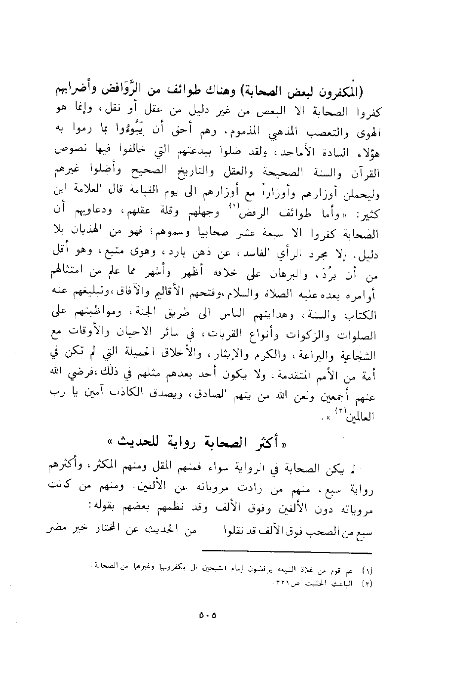 وهناك طوائف من الروافض وأضرابهم كفروا الصحابة إلا البعض من غير دليل من عقل أو نقل، وإنما هو الهوى والتعصب المذهبي المذموم، وهم أحق أن يبوءوا بما رموا به هؤلاء السادة الأماجد، ولقد ضلوا ببدعتهم التي خالفوا فيها نصوص القرآن والسنة الصحيحة والعقل والتاريخ الصحيح وأضلوا غيرهم, وليحملن أوزارهم وأوزارا مع أوزارهم إلى يوم القيامة. قال العلامة ابن كثير: "وأما طوائف الرفض1 وجهلهم, وقلة عقلهم، ودعاويهم أن الصحابة كفروا إلا سبعة عشر صحابيا وسموهم, فهو من الهذيان بلا دليل, إلا مجرد الرأي الفاسد، عن ذهن بارد، وهو متبع، وهو أقل من أن يرد، والبرهان على خلافه أظهر وأشهر مما علم من امتثالهم أوامره بعده عليه الصلاة والسلام، وفتحهم الأقاليم والآفاق، وتبليغهم عنه الكتاب والسنة، وهدايتهم الناس إلى طريق الجنة، ومواظبتهم على الصلوات والزكوات وأنواع القربات، في سائر الأحيان والأوقات مع الشجاعة والبراعة، والكرم والإيثار، والأخلاق الجميلة التي لم تكن في أمة من الأمم المتقدمة، ولا يكون أحد بعدهم مثله في ذلك، فرضي الله عنهم أجمعين ولعن الله من يتهم الصادق، ويصدق الكاذب, آمين يا رب العالمين"2.