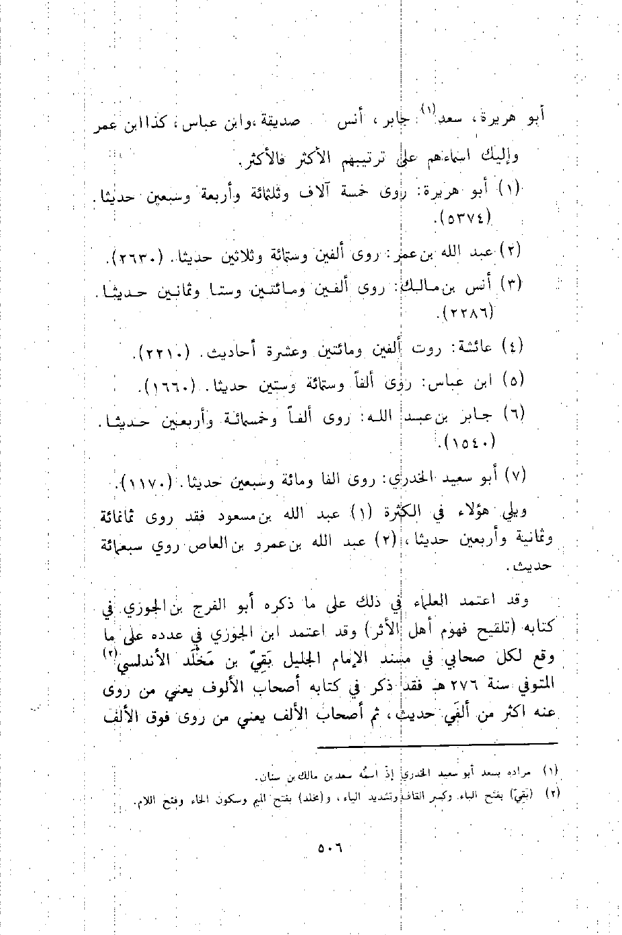 وقد اعتمد العلماء في ذلك على ما ذكره أبو الفرج بن الجوزي في كتابه "تلقيح فهوم أهل الأثر", وقد اعتمد ابن الجوزي في عدده على ما وقع لكل صحابي في مسند الإمام الجليل بقي بن مخلد الأندلسي2 المتوفى سنة 276هـ, فقد ذكر في كتابه أصحاب الألوف يعني من روى عنه أكثر من ألفي حديث، ثم أصحاب الألف يعني من روى فوق الألف