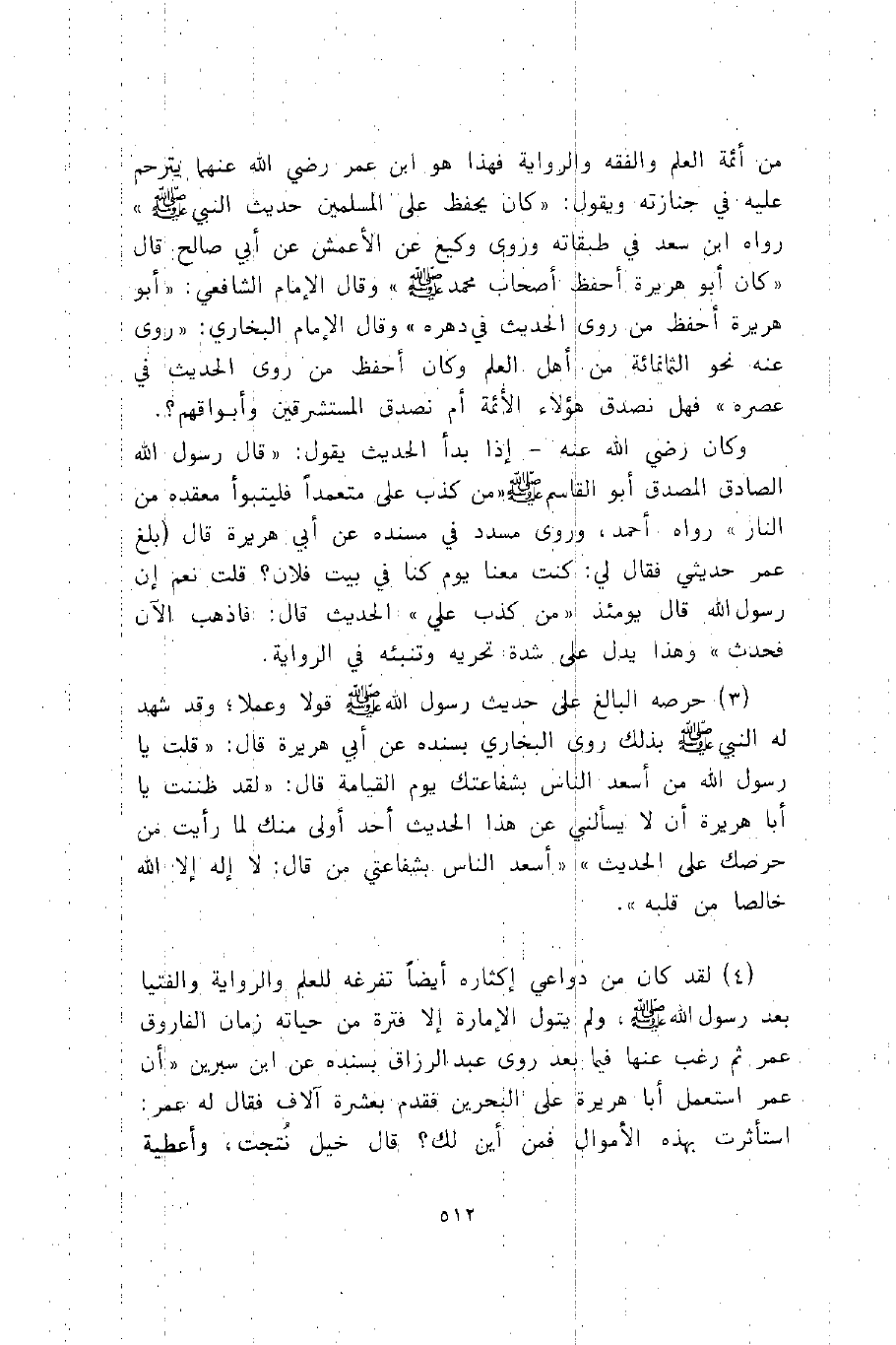 وكان رضي الله عنه إذا بدأ الحديث يقول: قال رسول الله الصادق المصدوق أبو القاسم -صلى الله عليه وسلم: "من كذب عليّ متعمدا فليتبوأ مقعده من النار" , رواه أحمد، وروى مسدد في مسنده عن أبي هريرة قال: "بلغ عمر حديثي فقال لي: كنت معنا يوم كنا في بيت فلان؟ قلت: نعم إن رسول الله قال يومئذ: "من كذب عليّ ... " الحديث, قال: فاذهب الآن فحدث", وهذا يدل على شدة تحريه وتنبئه في الرواية.