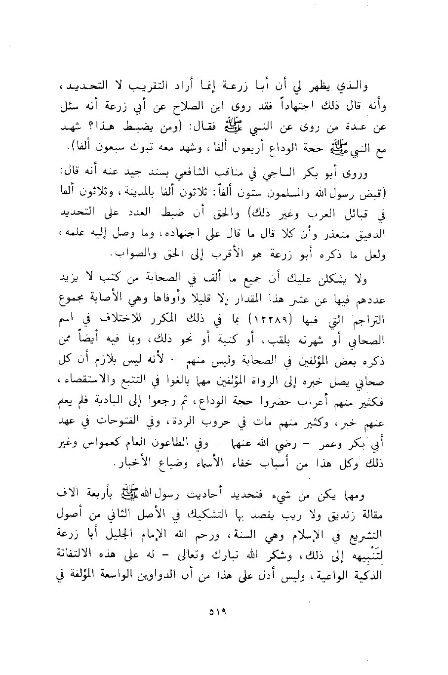 وروى أبو بكر الساجي في مناقب الشافعي بسند جيد عنه أنه قال: "قبض رسول الله والمسلمون ستون ألفا: ثلاثون ألفا بالمدينة، وثلاثون ألفا في قبائل العرب وغير ذلك", والحق أن ضبط العدد على التحديد الدقيق متعذر وأن كلا قال ما قال على اجتهاده، وما وصل إليه علمه، ولعل ما ذكره أبو زرعة هو الأقرب إلى الحق والصواب.