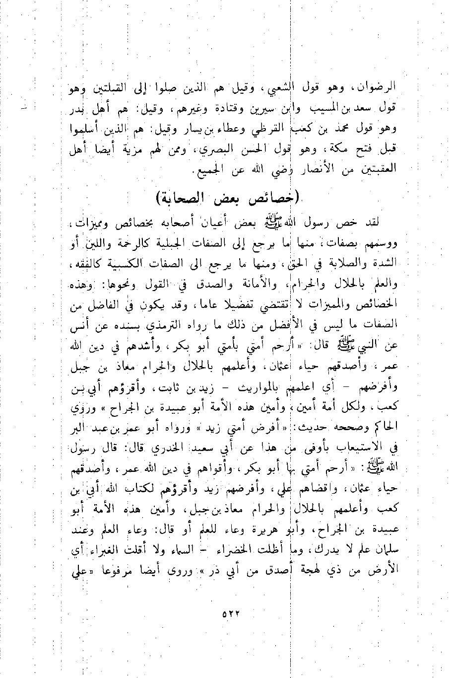 لقد خص رسول الله -صلى الله عليه وسلم- بعض أعيان أصحابه بخصائص ومميزات، ووسمهم بصفات، منها ما يرجع إلى الصفات الجبلية كالرحمة واللين أو الشدة والصلابة في الحق، ومنها ما يرجع إلى الصفات الكسبية كالفقه، والعلم بالحلال والحرام، والأمانة والصدق في القول ونحوها, وهذه الخصائص والمميزات لا تقتضي تفضيلا عاما، وقد يكون في الفاضل من الصفات ما ليس في الأفضل من ذلك ما رواه الترمذي بسنده عن أنس عن النبي -صلى الله عليه وسلم- قال: "أرحم أمتي بأمتي أبو بكر، وأشدهم في دين الله عمر، وأصدقهم حياء عثمان، وأعلمهم بالحلال والحرام معاذ بن جبل وأفرضهم -أي أعلمهم بالمواريث- زيد بن ثابت، وأقرؤهم أبي بن كعب، ولكل أمة أمين، وأمين هذه الأمة أبو عبيدة بن الجراح". وروى الحاكم وصححه حديث: "أفرض أمتي زيد" , ورواه أبو عمر بن عبد البر في الاستيعاب بأوفى من هذا عن أبي سعيد الخدري قال: قال رسول الله -صلى الله عليه وسلم: "أرحم أمتي بها أبو بكر، وأقواهم في دين الله عمر، وأصدقهم حياء عثمان، وأقضاهم عليّ، وأفرضهم زيد وأقرؤهم لكتاب الله أبي بن كعب وأعلمهم بالحلال والحرام معاذ بن جبل، وأمين هذه الأمة أبو عبيدة بن الجراح، وأبو هريرة وعاء للعلم -أو قال: وعاء العلم- وعند سلمان علم لا يدرك، وما أظلت الخضراء -السماء- ولا أقلت الغبراء -أي الأرض- من ذي لهجة أصدق من أبي ذر". وروي أيضا مرفوعا: "عليّ