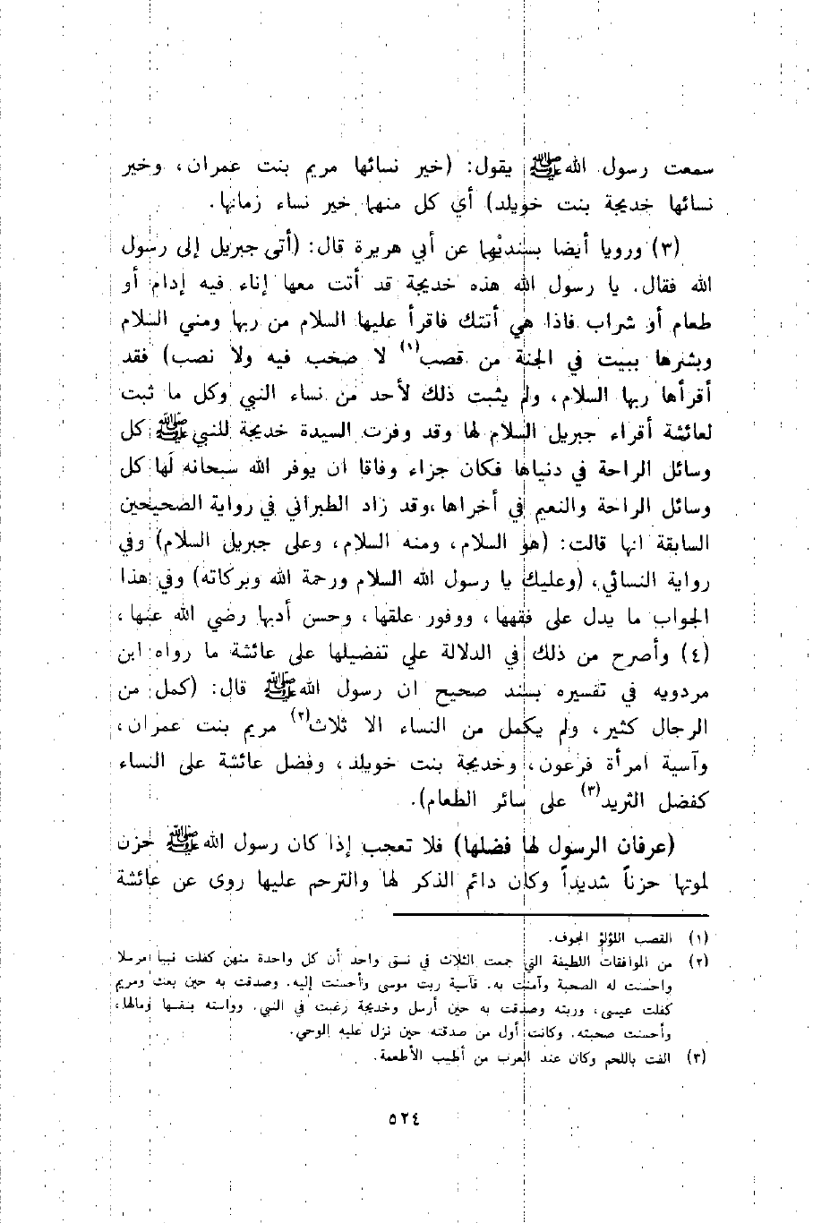 4- وأصرح من ذلك في الدلالة على تفضيلها على عائشة ما رواه ابن مردويه في تفسيره بسند صحيح أن رسول الله -صلى الله عليه وسلم- قال: "كمل من الرجال كثير، ولم يكمل من النساء إلا ثلاث 2 مريم بنت عمران، وآسية امرأة فرعون، وخديجة بنت خويلد، وفضل عائشة على النساء كفضل الثريد3 على سائر الطعام".