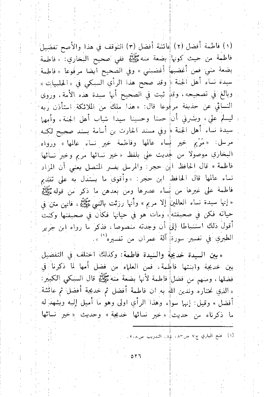 "بين السيدة خديجة والسيدة فاطمة": وكذلك اختلف في التفضيل بين خديجة وابنتها فاطمة، فمن العلماء من فضل أمها لما ذكرنا في فضلها، ومنهم من فضل فاطمة؛ لأنها بضعة منه -صلى الله عليه وسلم- قال السبكي الكبير: "الذي نختاره وندين الله به أن فاطمة أفضل ثم خديجة أفضل ثم عائشة أفضل", وقيل: إنهما سواء وهذا الرأي أولى وهو ما أميل إليه ويشهد له ما ذكرناه من حديث: "خير نسائها خديجة". وحديث: "خير نسائها