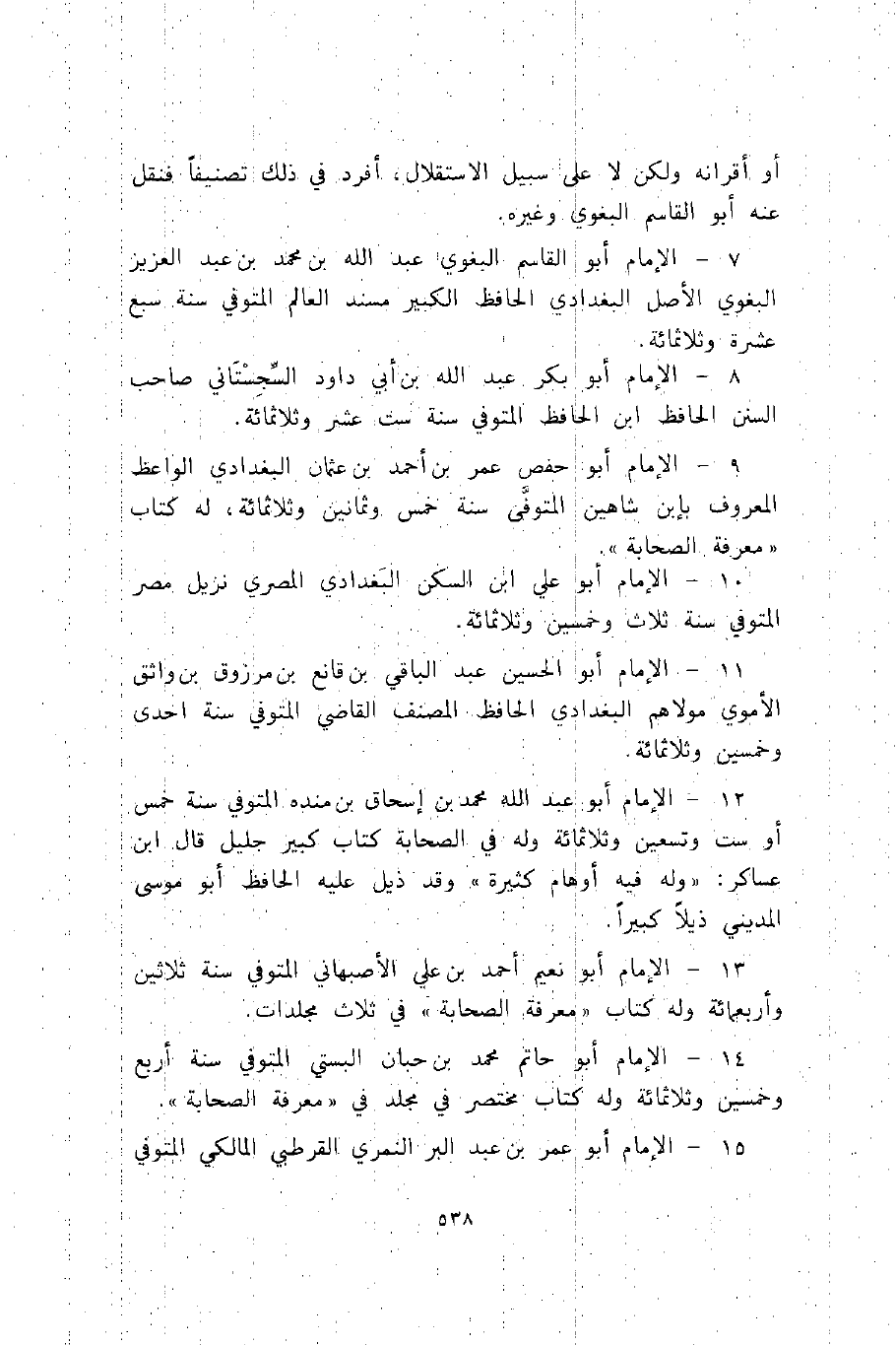 13- الإمام أبو نعيم أحمد بن علي الأصبهاني, المتوفى سنة ثلاثين وأربعمائة, وله كتاب "معرفة الصحابة" في ثلاث مجلدات.